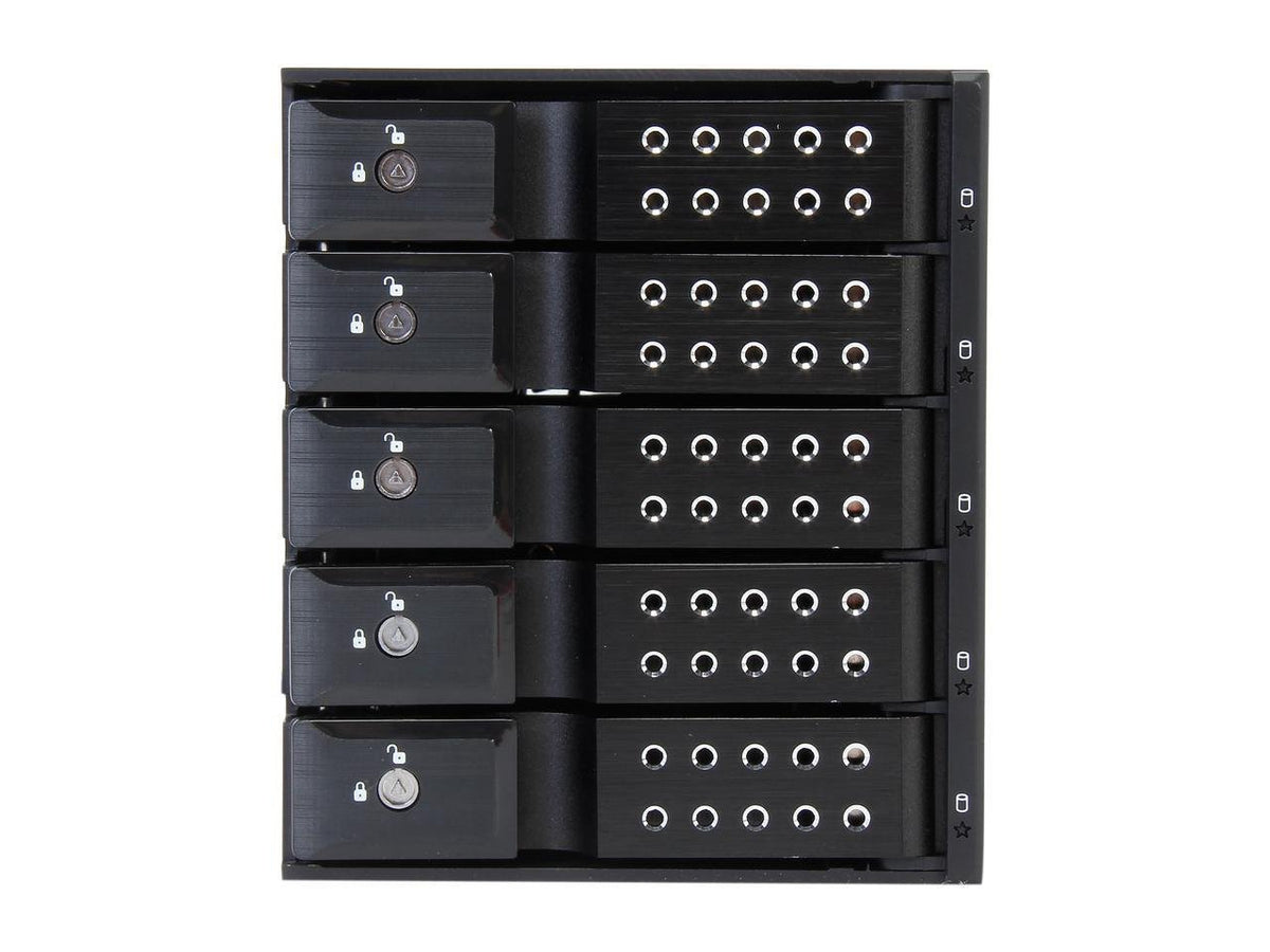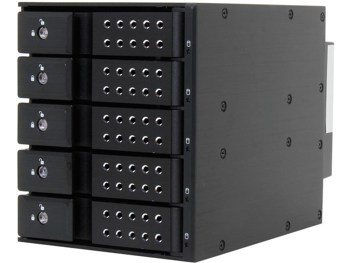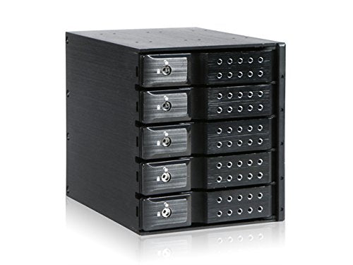 Q: What are the key features of the iStarUSA Group 3x5.25 to 5x3.5 Trayless Black?A: The iStarUSA Group 3x5.25 to 5x3.5 Trayless Black features a lightweight aluminum frame, tray-less and screw-less HDD mounting, an aluminum front bezel with a metal key lock mechanism for security, and integrative shaping designed for optimal heat dissipation. It also supports hot-swap and RAID configurations, although an additional RAID controller is required.