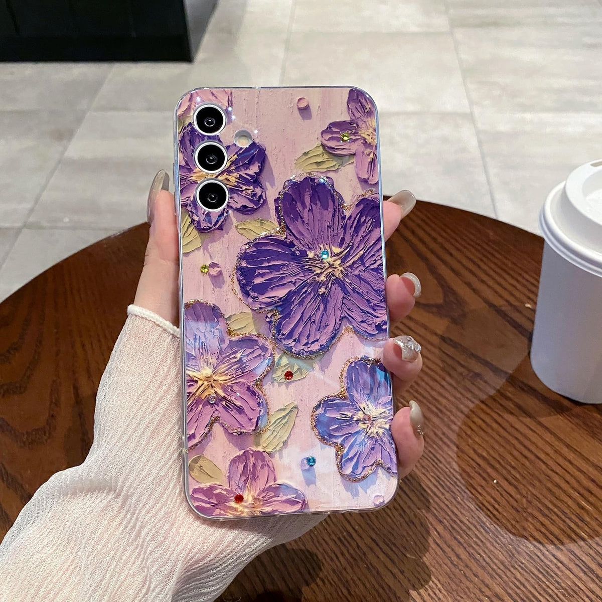 Leleyun Case For Samsung Galaxy A55 5G, Retro Oil Painting Printed Flower Cute Pattern With Glitter Gem Phone Cover Durable Tpu Shockproof Protective Case For Girls Women