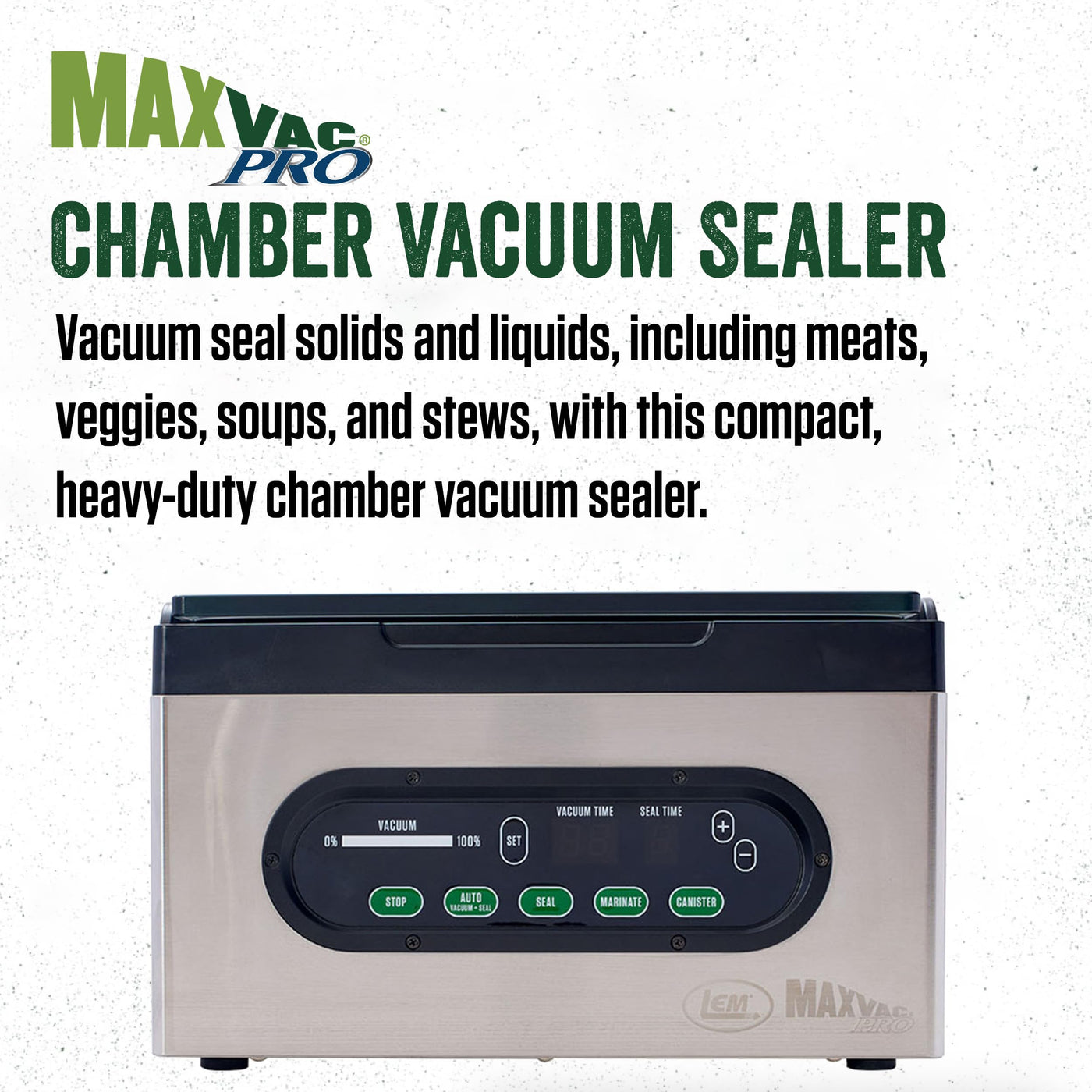 Take Your Food Preservation To The Next Level With The Lem Products Maxvac Pro Chamber Vacuum Sealer. This Heavy-Duty Countertop Unit Is Built For Serious Sealing, Handling Liquids, Solids, And Delicate Foods With Ease. The Maintenance-Free Pump Requires No Oil And Delivers Powerful, Reliable Performance With Every Cycle, Creating An Airtight Seal For Meat, Vegetables, Meals, Soups, And More. With Customizable Vacuum And Seal Times And A Marinate Function, Youll Preserve Flavor, Prevent Freezer Burn, And Reduce Prep Time. The Clear Glass Lid And Led Vacuum Progress Display Make It Easy To Monitor Sealing, While The Large 11.42 Bar Delivers Durable Dual 2.5Mm Seals. The Spacious Chamber Accommodates The Included Sealer Bags And Your Canning Jars When Laying Flat (Pint, Quart, Or Jelly). Use The Internal Canister Port And The Included Vacuum Hose To Seal Larger Jars And Accessories, Or Switch To External Sealing For Oversized Items And Textured Vacuum Bags. Compatible With Chamber Vacuum Bags Or Mylar Bags. Includes 40 Pint, 20 Quart, And 20 Gallon Chamber Sealer Bags, Extra Gasket, Removable Seal Bar, Dishwasher-Safe Riser Insert, And Vacuum Hose. This Machine Has A Compact Footprint And Non-Skid Feet - Perfect For Any Countertop Or Home Kitchen.