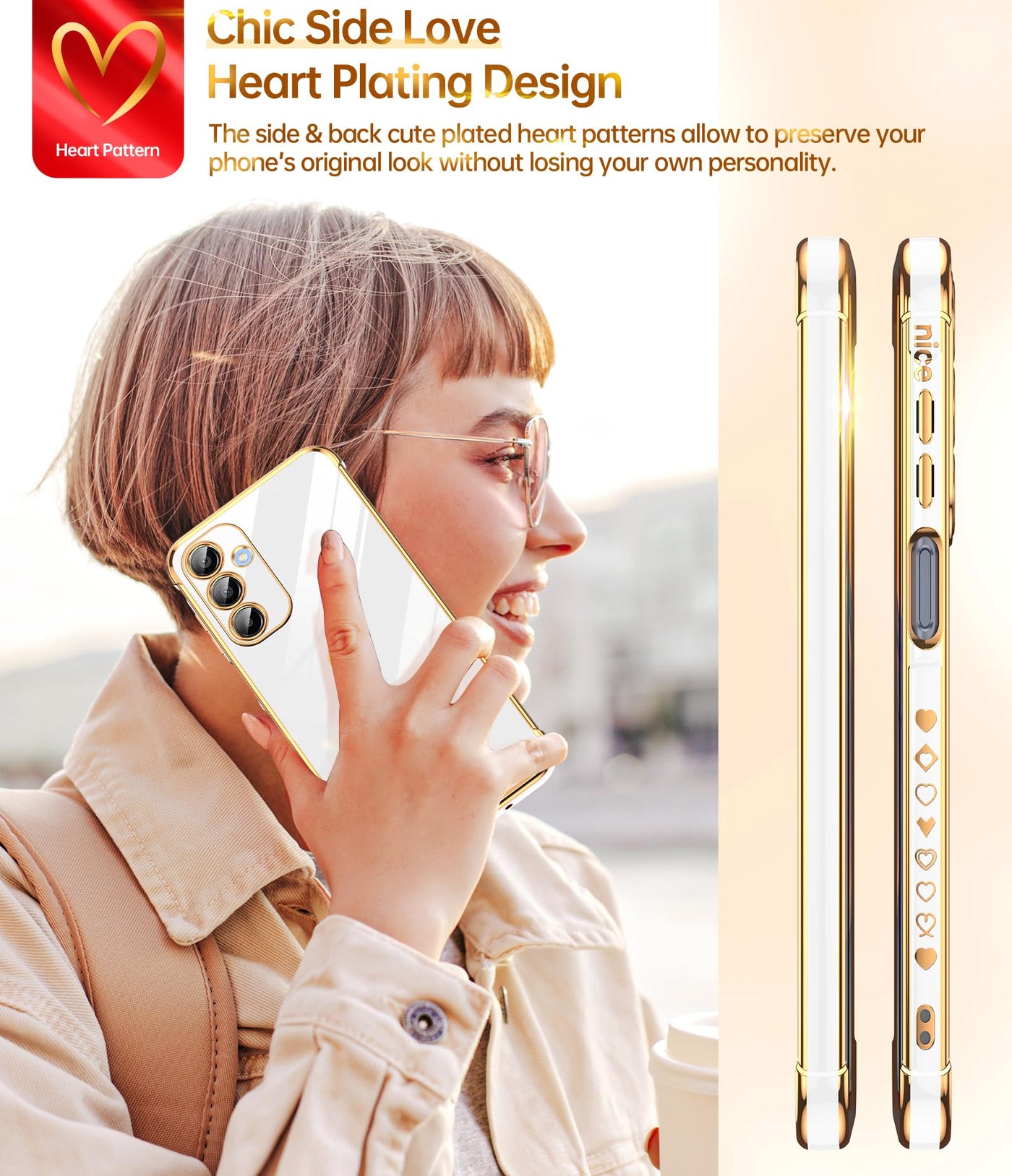 Q: Is the design of the case suitable for women?A: Yes, the case features a plated love heart design that is both cute and stylish, making it an ideal luxury accessory for women.