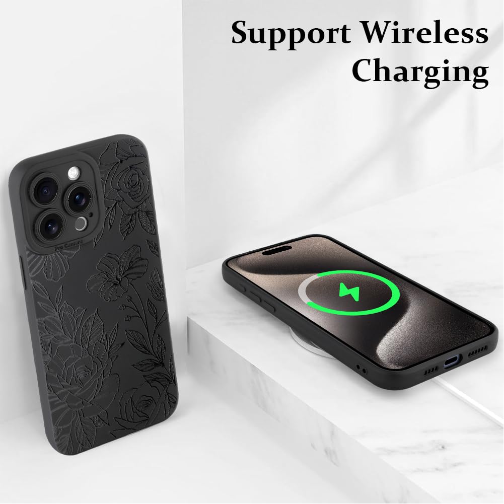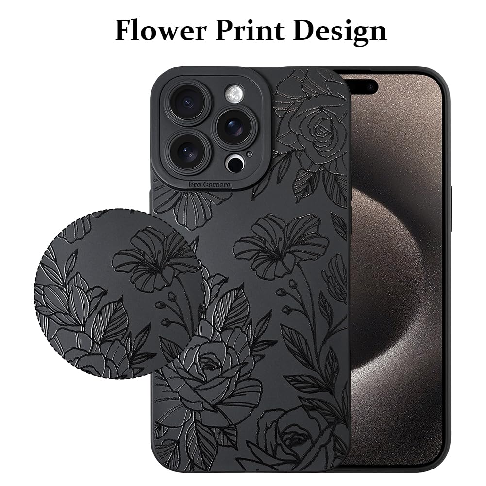 Lsl Case For Iphone 15 Pro Max Black Floral Flower Pattern Print Case Soft Tpu Full Camera Lens Anti Drop Anti Scratch Shockproo