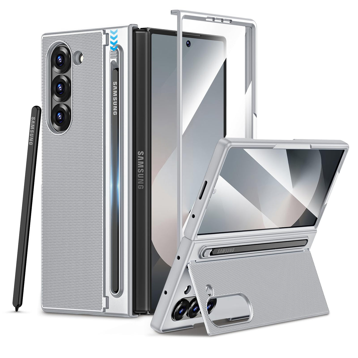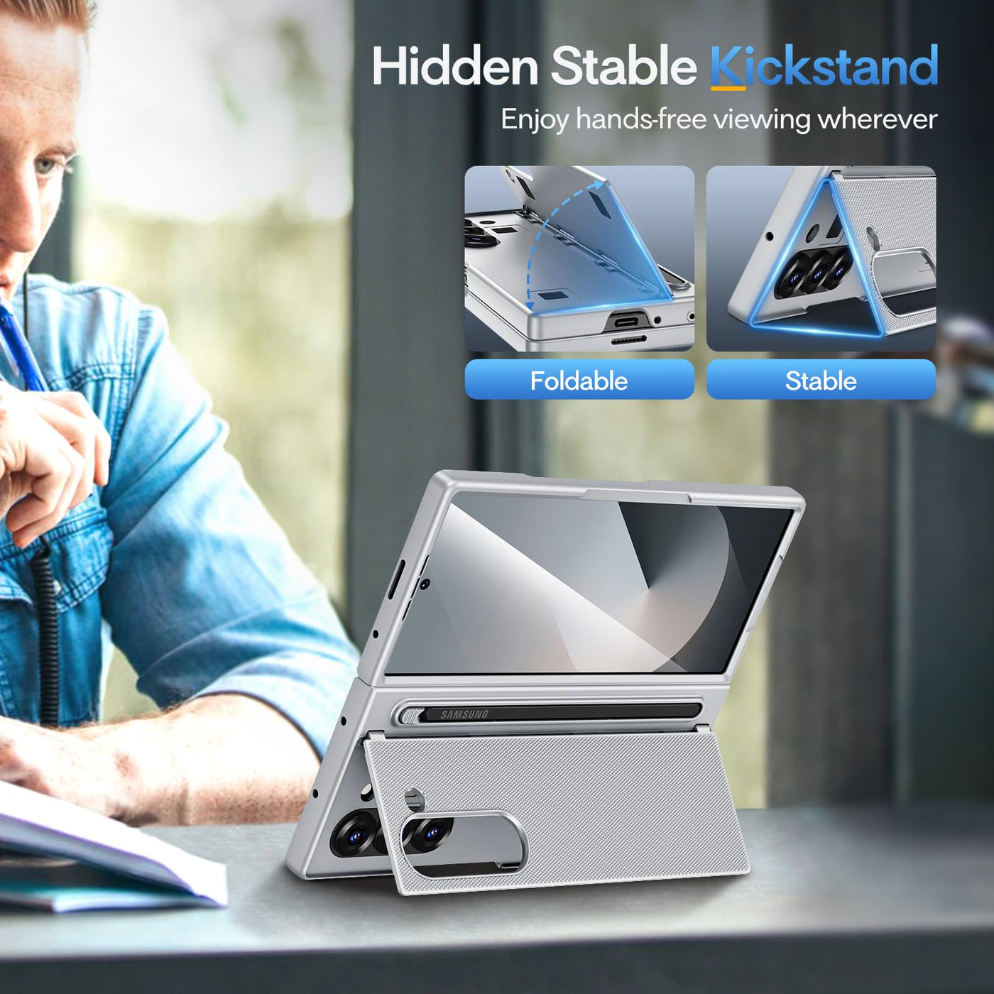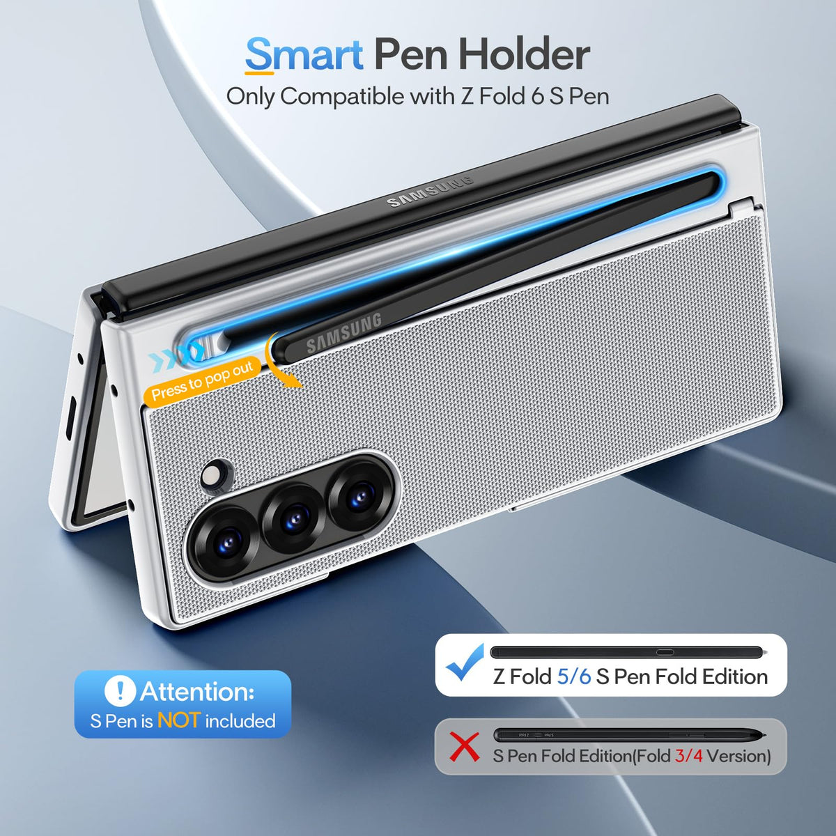 This Kickstand And Pen Holder Case Is Only Compatible With Samsung Galaxy Z Fold 6 (2024) And The Z Fold5/ Z Fold6 S Pen Edition. This Samsung Fold 6 Case Has A Built-In Temepered Glass Screen Protector Which Protects Your Front Screen From Drops And Scratches. The Z Fold 6 Case With Stand Allows You To Enjoy Hands-Free Viewing Everywhere. When The Stand Feature Is Not In Use, This Foldable Stand Is Ready To Hide And Allows Your Phone To Lie Flat On A Flat Surface. The Smart Pen Slot Provides Safe Storage And Quick Access To Your Z Fold 6 S Pen. Press The Top Button To Pop Out The Pen And Just Snap It Into The Holder When Storing It Away. (Note: The Pen Holder Only Fits The Z Fold 5/6 S Pen Fold Edition And The Pen Is Not Included)