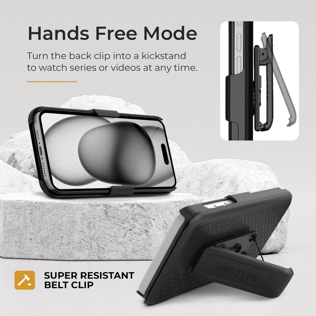 Q: Does the case come with a kickstand?A: Yes, the MOTIVE case includes an integrated kickstand that allows for hands-free viewing, making it perfect for watching videos or video calls.