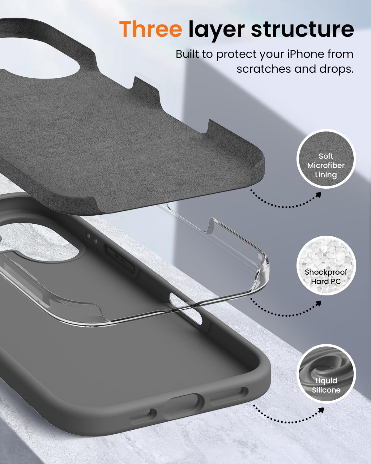 Q: What material is the OuXul iPhone 16 case made of?A: The OuXul iPhone 16 case is made from high-quality liquid silicone, which provides durability, toughness, and a comfortable smooth touch.