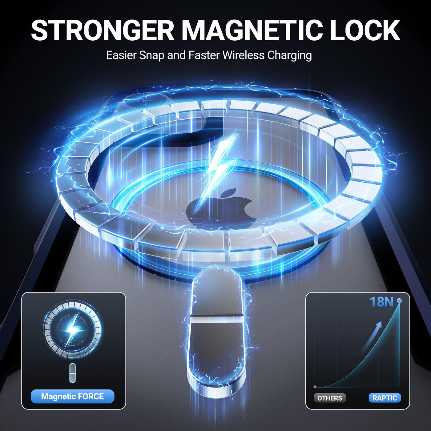 Q: Can I use magnetic accessories with the RAPTIC Shield 2.0 case?A: Yes, the RAPTIC Shield 2.0 case is designed with 35 pieces of N52 magnets that are optimized for alignment and efficiency, allowing for fast charging and secure connections with magnetic accessories like wallets and car mounts.