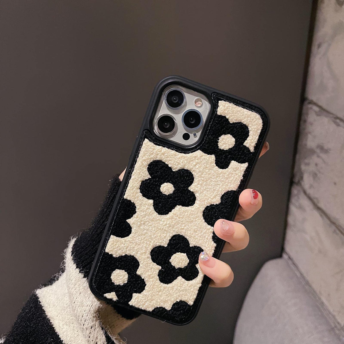 Retro Small Black Flowers Phone Case Compatible With Iphone 13 Pro Max Cute Design Girly Warm Fur Winter Slim Soft Bumper +Terry