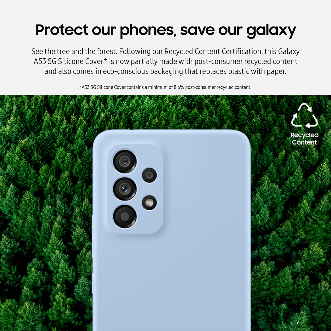 See The Tree And The Forest. Following Our Recycled Content Certification, This Galaxy A53 5G Silicone Cover Is Now Partially Made With Post-Consumer Recycled Content And Also Comes In More Eco-Friendly Packaging That Replaces Plastic With Paper. The Silicone Cover Offers Protection That Still Easily Slides Into Your Pocket. While Keeping The Slim Profile Of Your Galaxy A53 5G Intact, It Protects Your Phone From Shocks And Bumps. Soft, Matte Silicone Surrounds Your Phone For A Silky Finish You Wont Want To Put Down. And Because Its So Comfortable In Your Hands, You Wont Have To.* Designed To Fit Perfectly Inside Your Palm, The Silicone Cover Is Not Only Smooth In Its Looks, But Also In Its Touch. Grip It Comfortably Along Its Sleek, Matte Finish And Use Straps** For Added Convenience And Personality. *Color And Model Availability May Vary Depending On Country Or Carrier. **Straps Sold Separately.