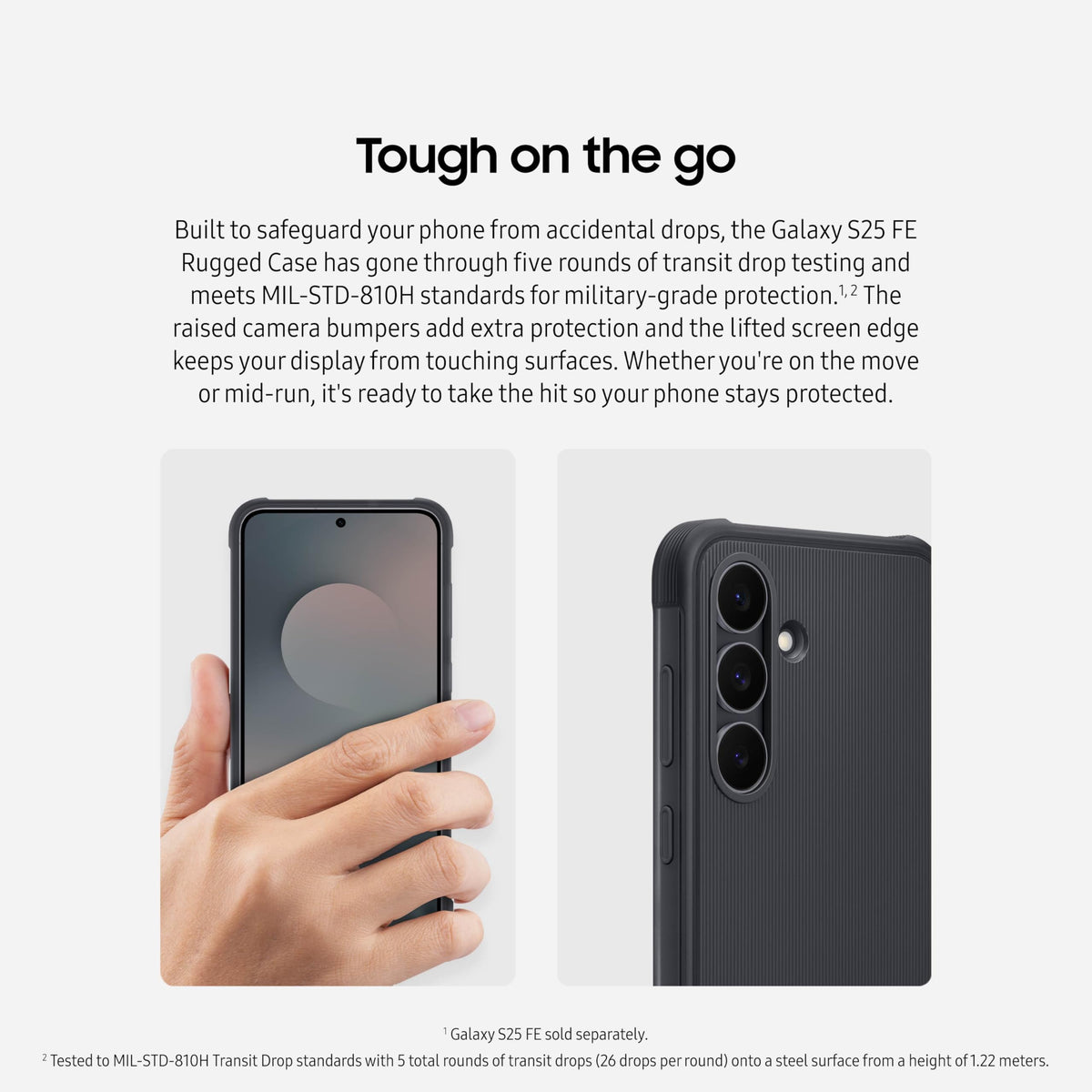 ;1 5X Tested To Mil-St-810H-5.16.8 Procedure Iv: Transit Drop, 26 Drops Per Round Onto Steel Surface Form Height Of 1.22 Meters. Be Ready For Any Adventure With The Military-Standard Galaxy S25 Fe Rugged Case.1,2 Its Sleek Yet Tough. Pocket Friendly Yet Rugged.Tested To Mil-Std-810H Transit Drop Standards With 5 Total Rounds Of Transit Drops (26 Drops Per Round) Onto A Steel Surface From A Height Of 1.22 Meters.Galaxy S25 Fe Sold Separately.