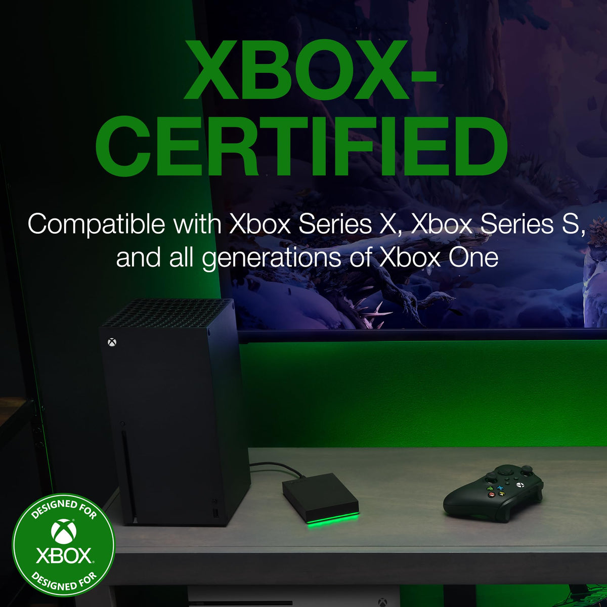 Q: Does the Seagate Game Drive have any unique design features?A: Yes, the Seagate Game Drive features a bold and refined design that complements your Xbox setup. Additionally, it has a built-in LED bar that illuminates in Xbox green, enhancing your gaming center's aesthetics.