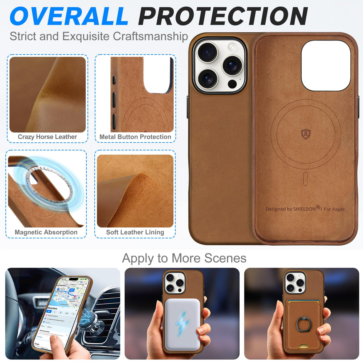 Shieldon Crazy Horse Leather Magnetic Wireless Charging Slim Non-Slip Shock-Absorbent Cover With Metal Buttons Compatible With I