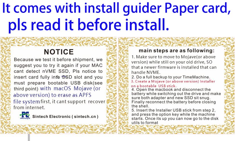 Notice:Because Too Many Customers Can Use It,I Suggest You To Try It Again If Your Mac Cant Detect Nvme Ssd. Pls Notice To Insert Card Fully Into Ssd Slot And You Must Prepare Bootable Usb Disk(See Third Point) With High Sierra To Format M.2 Ssd First, It Cant Support Recover From Internet. Main Steps Are As Following: 1. Make Sure To Move To High Sierra While Still On Your Old Drive, So That A Newer Firmware Is Installed That Can Handle Nvme. 2. Do A Full Backup To Your Timemachine. 3. Create A High Sierra Installer On A Bootable Usb Stick. 4. Open The Macbook And Disconnect The Battery While Switching Out The Drive And Make Sure Both Adapter And New Ssd Sit Snug. Finally Reconnect The Battery Before Closing The Shell. 5. Insert The Installer Usb Stick From Step 2, And Press The Option Key While The Machine Starts. Once Its Up You Can Now Go To The Disk Utils To Format