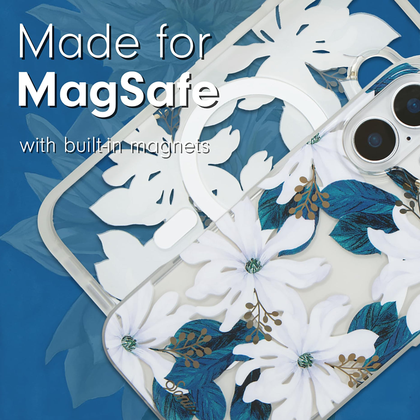 Q: What design options are available for the Sonix Case?A: The Sonix Case for iPhone 16 features a unique design with classic delicate white flowers, teal leaves, and gold foiled pollen details, making it a stylish accessory that combines fashion with functionality.