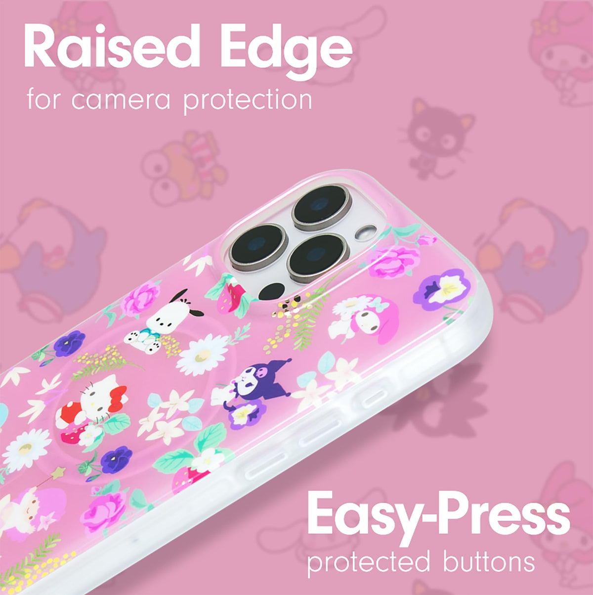 Q: What unique designs does the Sonix x Sanrio Case feature?A: The case showcases beloved Sanrio characters such as Hello Kitty, My Melody, and Kuromi in a whimsical floral design, complete with gold foil details on a rosy beige jelly background.
