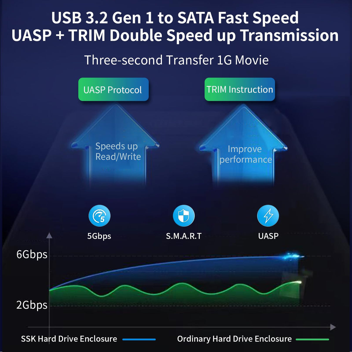 Q: How does the UASP feature enhance data transfer speeds?A: The UASP (USB Attached SCSI Protocol) feature allows for accelerated data transfer speeds, providing up to 20% faster performance compared to traditional USB 3.0. This is especially beneficial when transferring large files or using SSDs.
