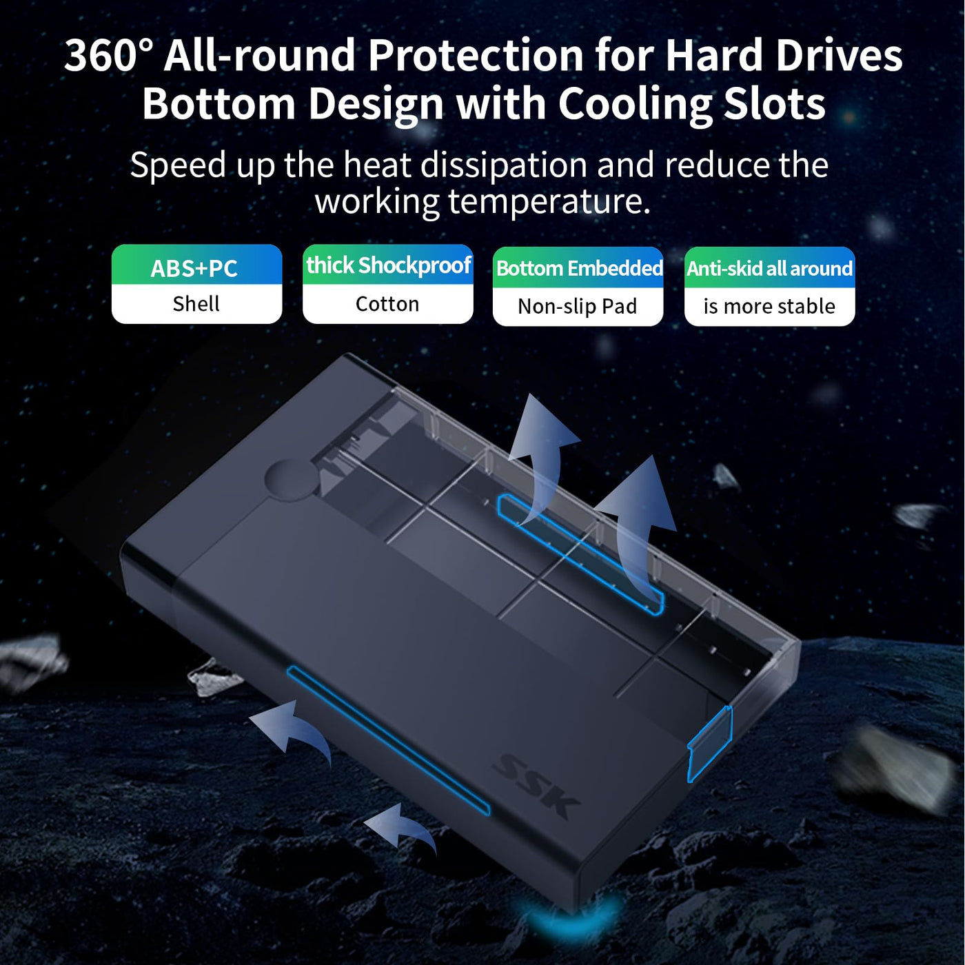 Q: What types of hard drives are compatible with the SSK 3.5 External Hard Drive Enclosure?A: The SSK 3.5 External Hard Drive Enclosure is designed for both 3.5 inch and 2.5 inch SATA HDD and SSD drives, supporting a maximum storage capacity of up to 20TB. It is compatible with various brands, including WD, Seagate, Toshiba, Hitachi, Samsung, and Crucial.