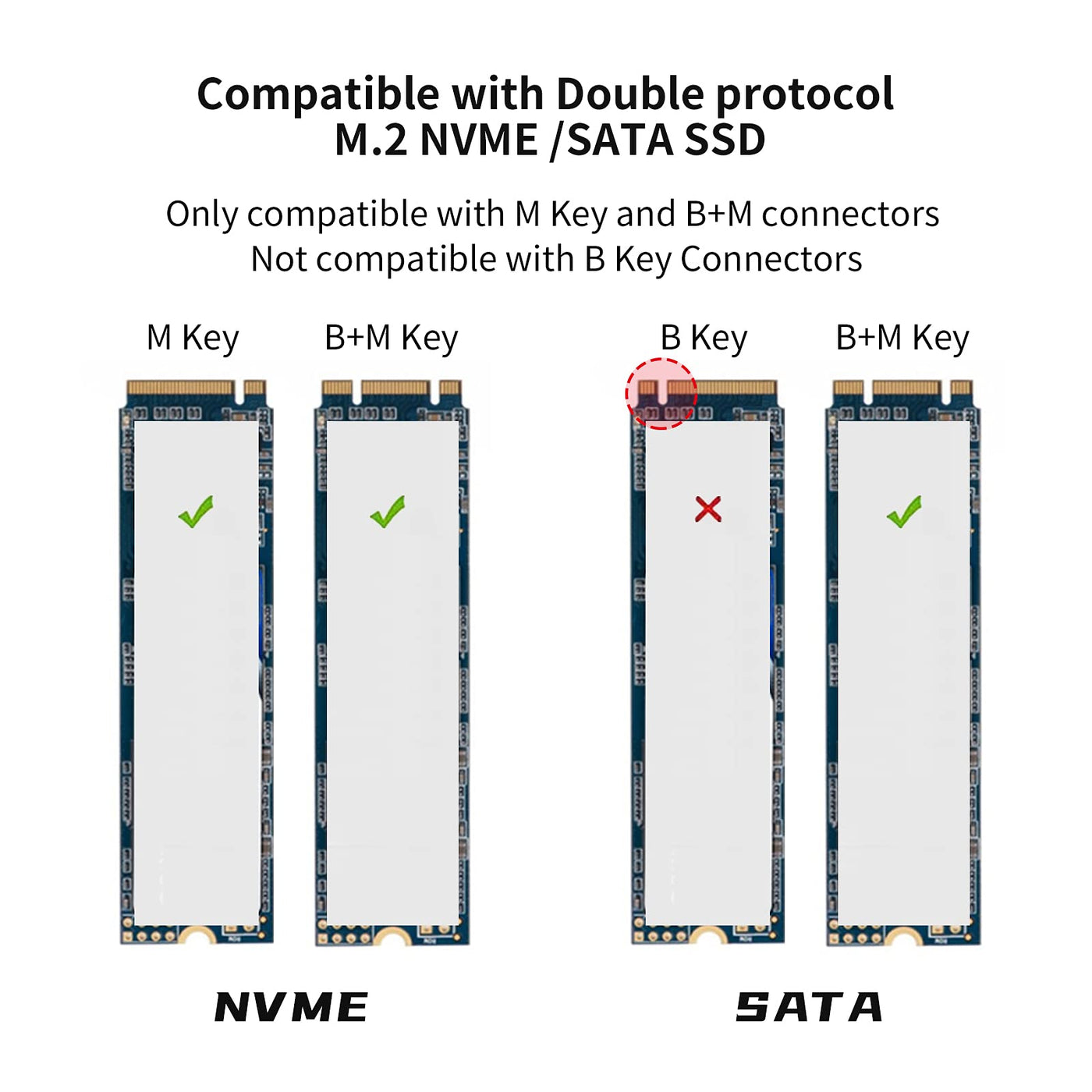 Q: What types of SSDs are compatible with the SSK Aluminum M.2 NVME SATA SSD Enclosure?A: The SSK Aluminum M.2 NVME SATA SSD Enclosure is compatible with both NVME PCIe M key and SATA NGFF SSDs in sizes 2230, 2242, 2260, and 2280. However, it does not support B Key connectors, mSATA SSDs, or non-M.2 form factor SSDs.
