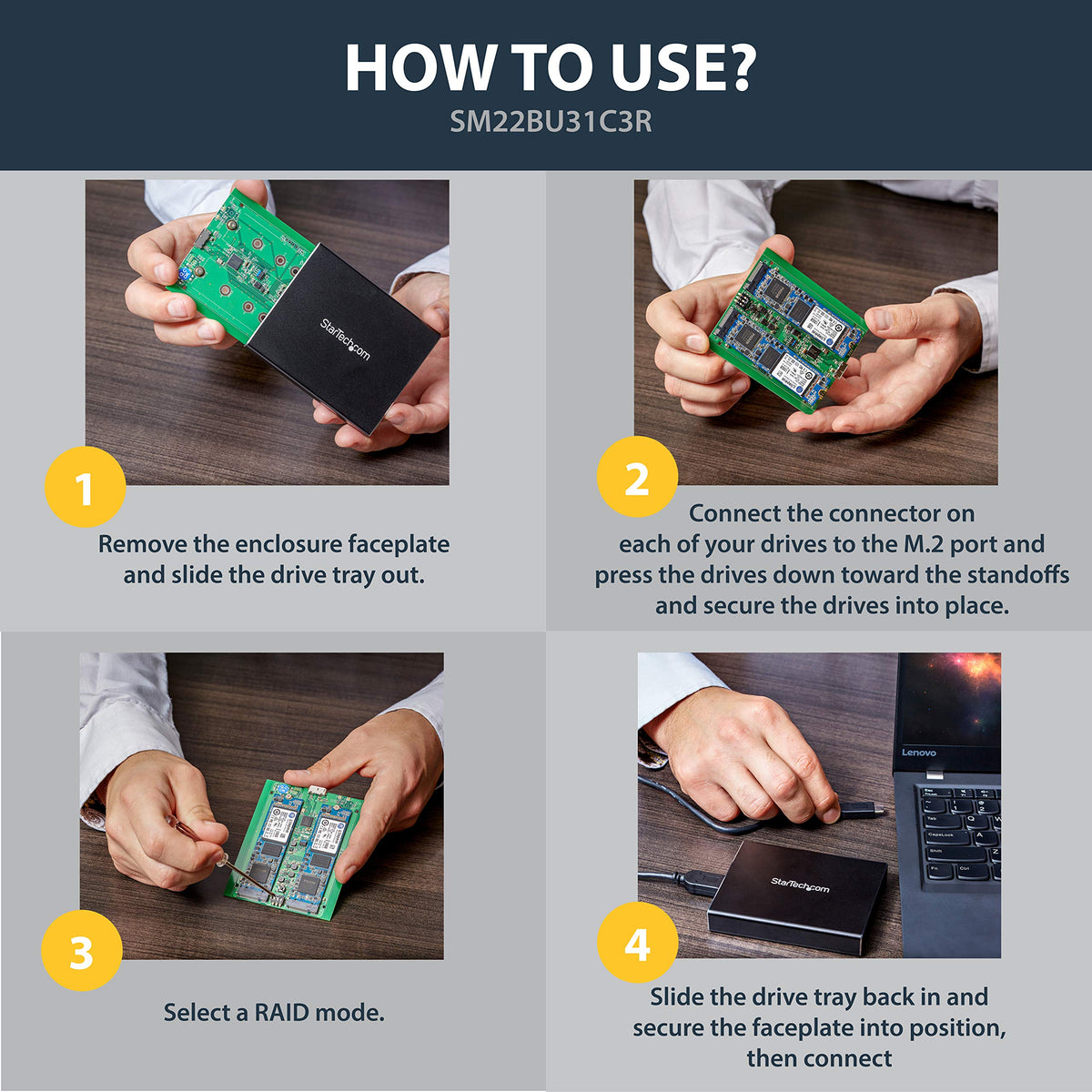Q: What types of M.2 SSDs are compatible with the StarTech.com Dual-Slot Hard Drive Enclosure?A: The StarTech.com Dual-Slot Hard Drive Enclosure supports all common M.2 SATA SSDs, including sizes 2230, 2242, 2260, and 2280. Please note that it is not compatible with M.2 NVMe or AHCI PCI Express SSDs.