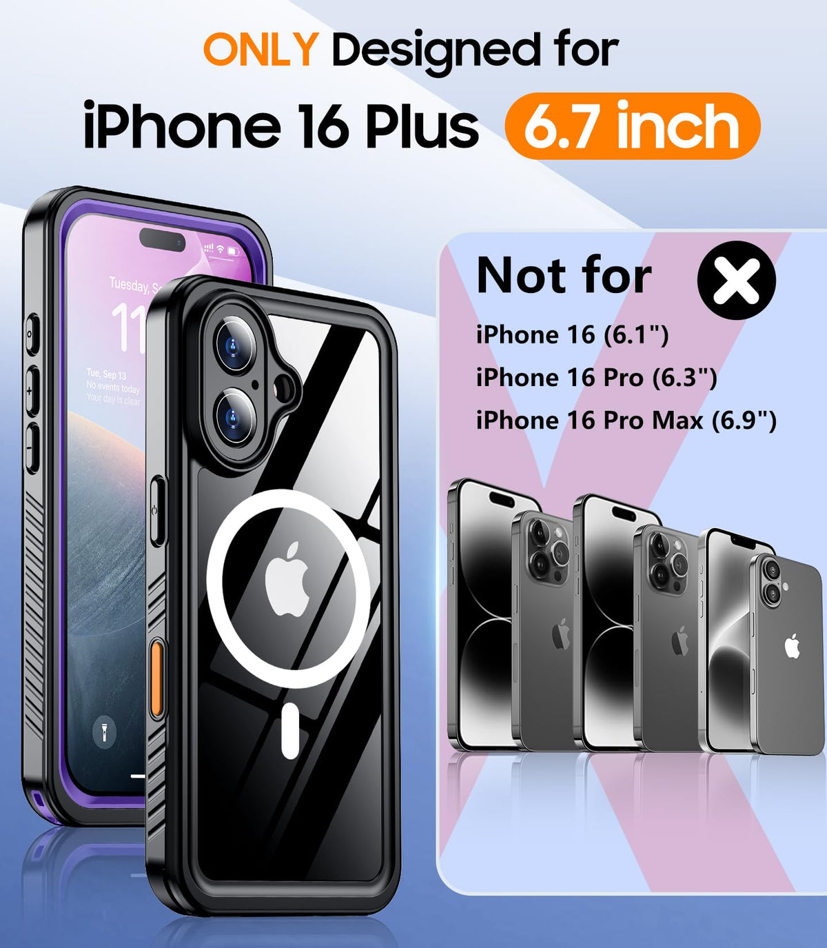 Temdan Magnetic For Iphone 16 Plus Case Waterproof,Built-In Screen Protector[Ip68 Underwater][Upgrade Military Dropproof][Compatible With Magsafe] Full Body Shockproof Translucent Case 6.7''-Purple