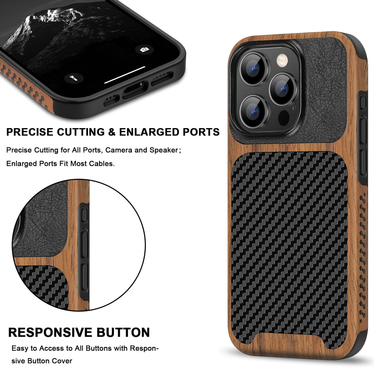 Tendlin Magnetic Slim Case Compatible With Iphone 15 Pro Max Black | Wood Grain, Carbon Fiber Texture Design, Leather, Hybrid, C