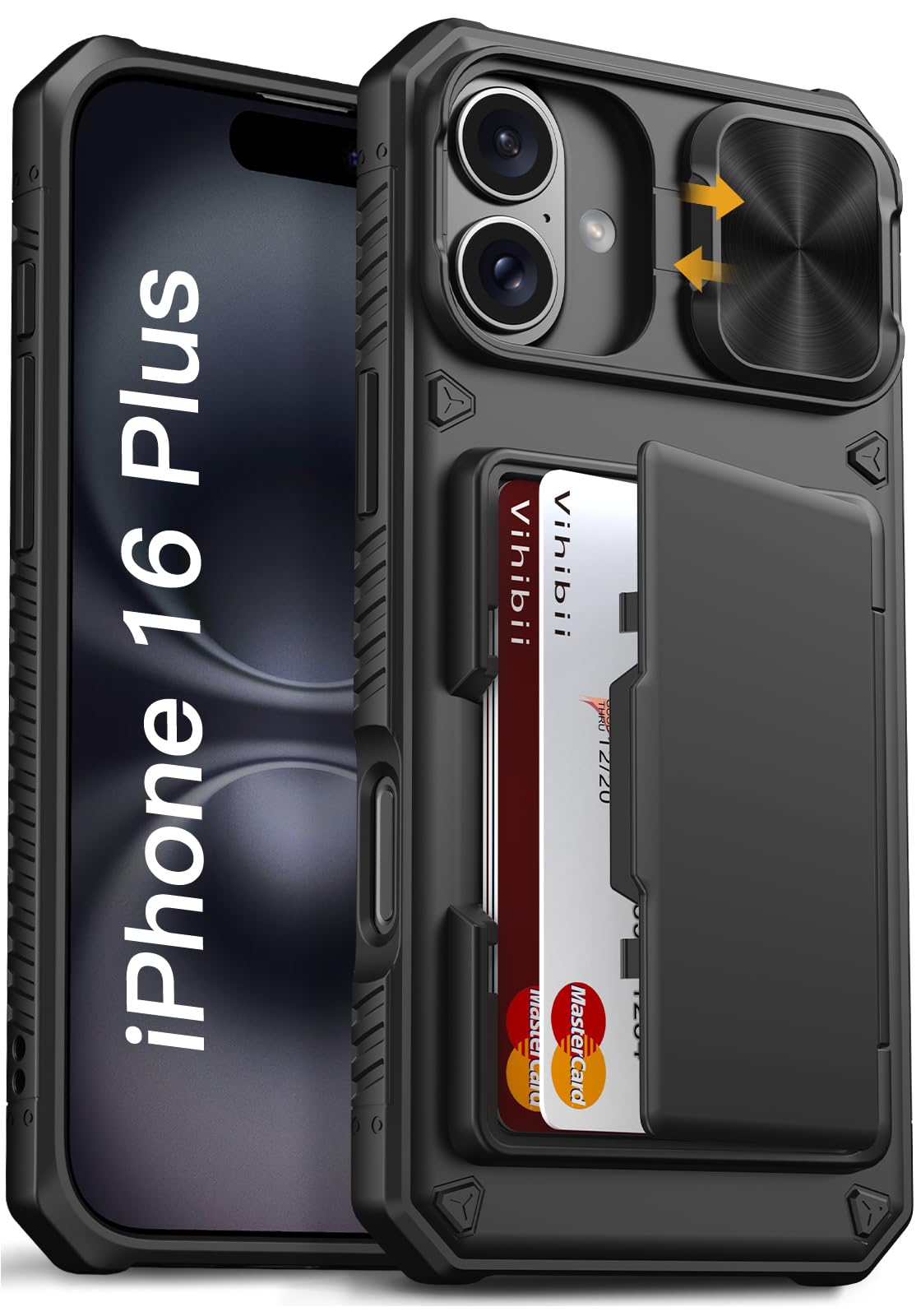 Vihibii For Iphone 16 Plus Case Wallet With Card Holder (4 Cards) [Rfid Blocking] & Slide Camera Cover, Military Grade Drop Prot