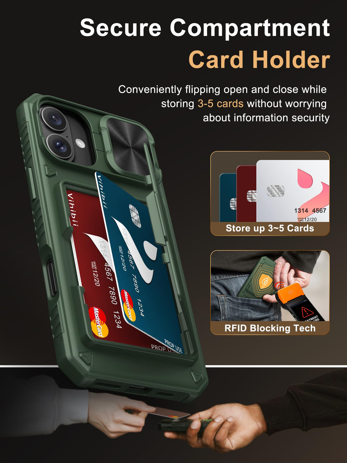 Vihibii For Iphone 16 Plus Case With Card Holder (4 Cards) [Rfid Blocking] & Slide Camera Cover, Military Grade Drop Protection,
