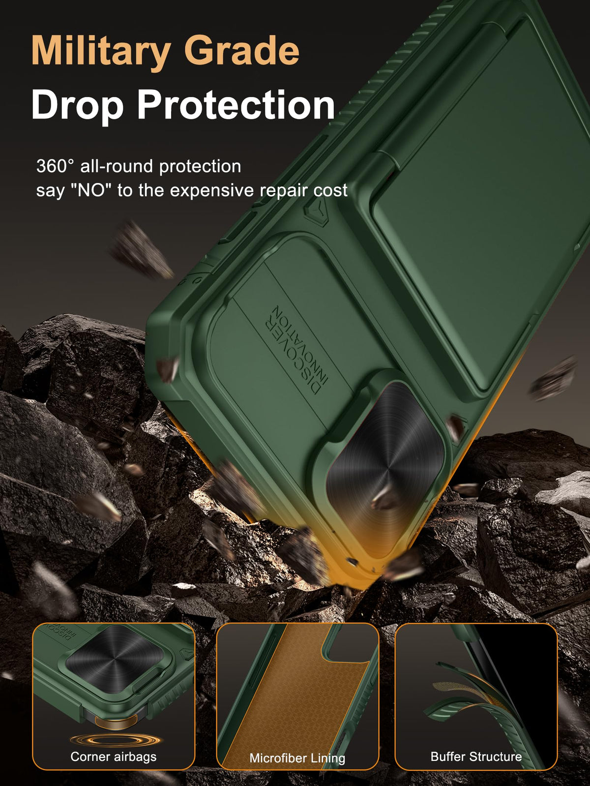 Q: How does the sliding camera lens protection work?A: The Vihibii case features a sliding camera lens protection cover that is 2mm thick. You can easily slide it open or closed to protect your camera lens from scratches and damage when not in use.