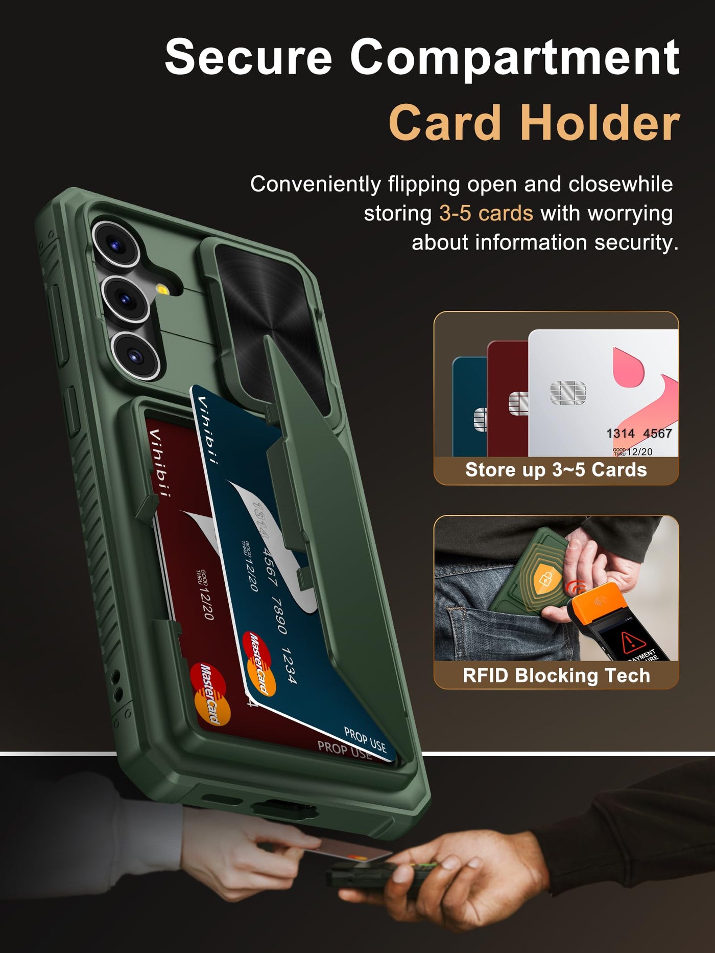 Q: How many cards can the card holder in the Vihibii case hold?A: The card holder in the Vihibii case can securely store 4 to 5 cards or a small amount of cash, allowing you to carry your essentials without the bulk of a traditional wallet.
