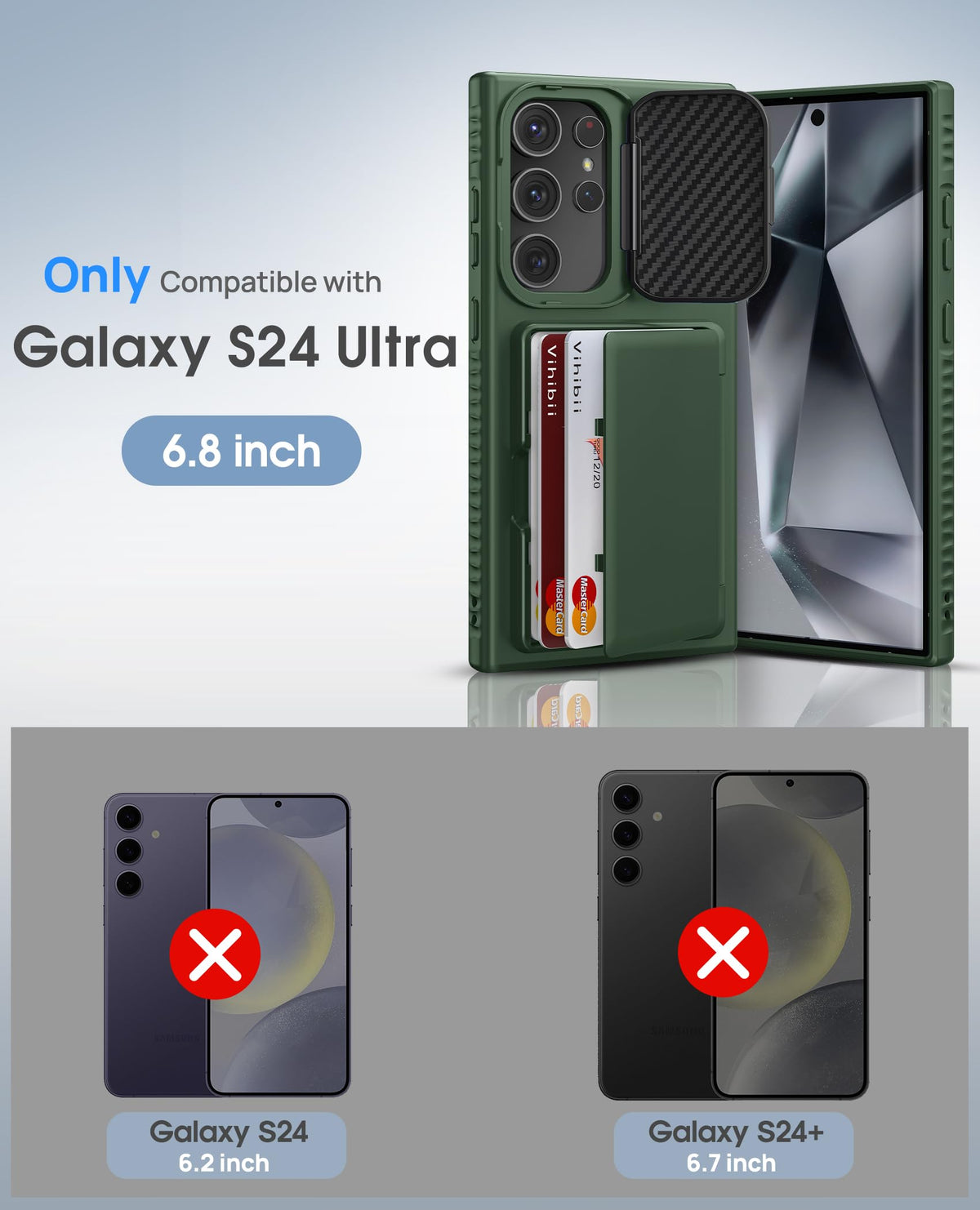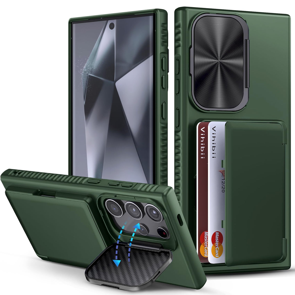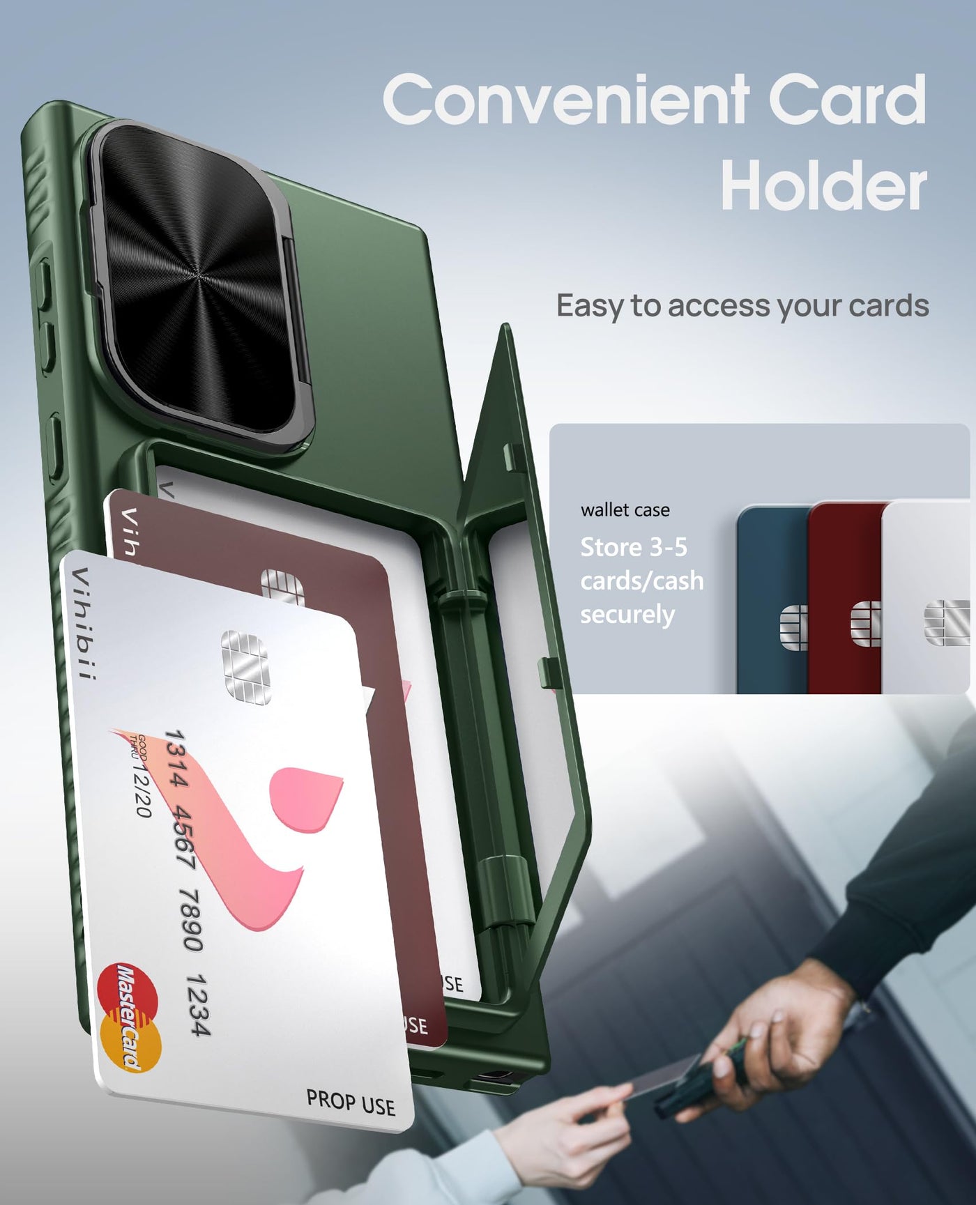Vihibii For Samsung Galaxy S24 Ultra Case With Card Holder (4 Cards) & Stand & Camera Lens Cover & Raised Edges Protect Screen,