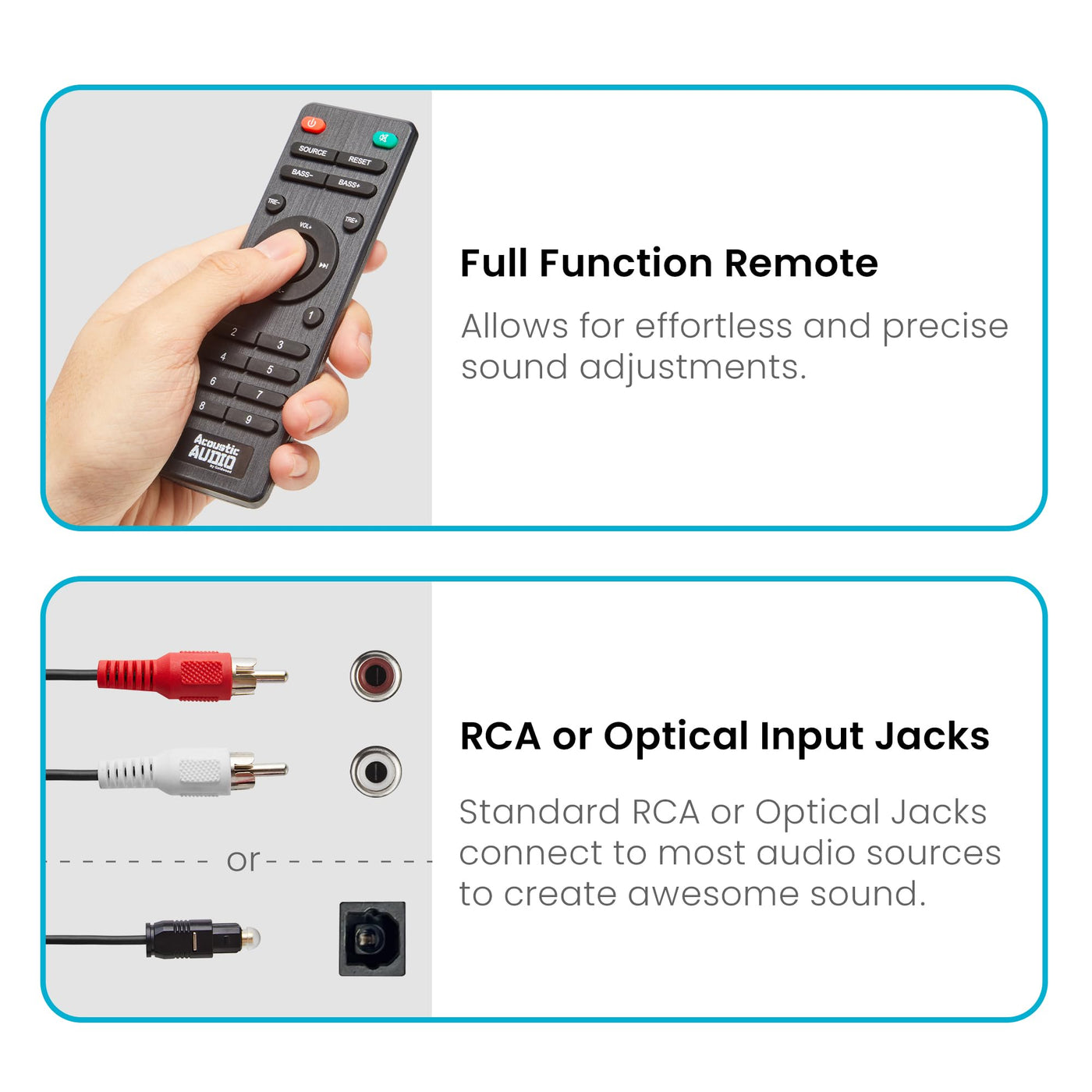 Introducing The Acoustic Audio By Goldwood 2.1 Speaker System, A Versatile Audio Solution Designed To Elevate Your Gaming, Television Viewing, And Computer Experience, As Well As Offer Seamless Bluetooth Connectivity For Wireless Music Streaming. This System Combines Powerful Audio Performance With Sleek, Modern Design. The Dedicated Subwoofer Delivers Deep, Resonant Bass, Perfect For Immersive Gaming And Cinematic Experiences, While The Satellite Speakers Ensure Crystal-Clear Highs And Detailed Mid-Range Frequencies. You Can Easily Connect To Various Devices Using Rca, Optical, 3.5Mm Aux Inputs For Computers, Tvs And Gaming Consoles Or Bluetooth For Wireless Convenience, Allowing You To Enjoy Your Favorite Content With Ease From Any Source. With Intuitive Controls On The Subwoofer And Remote Control, You Can Adjust Volume, Bass Levels, And Switch Between Audio Sources Effortlessly. Upgrade Your Entertainment Setup With The Ultimate 2.1 Speaker System And Enjoy Exceptional Sound Quality Across All Your Multimedia Activities.