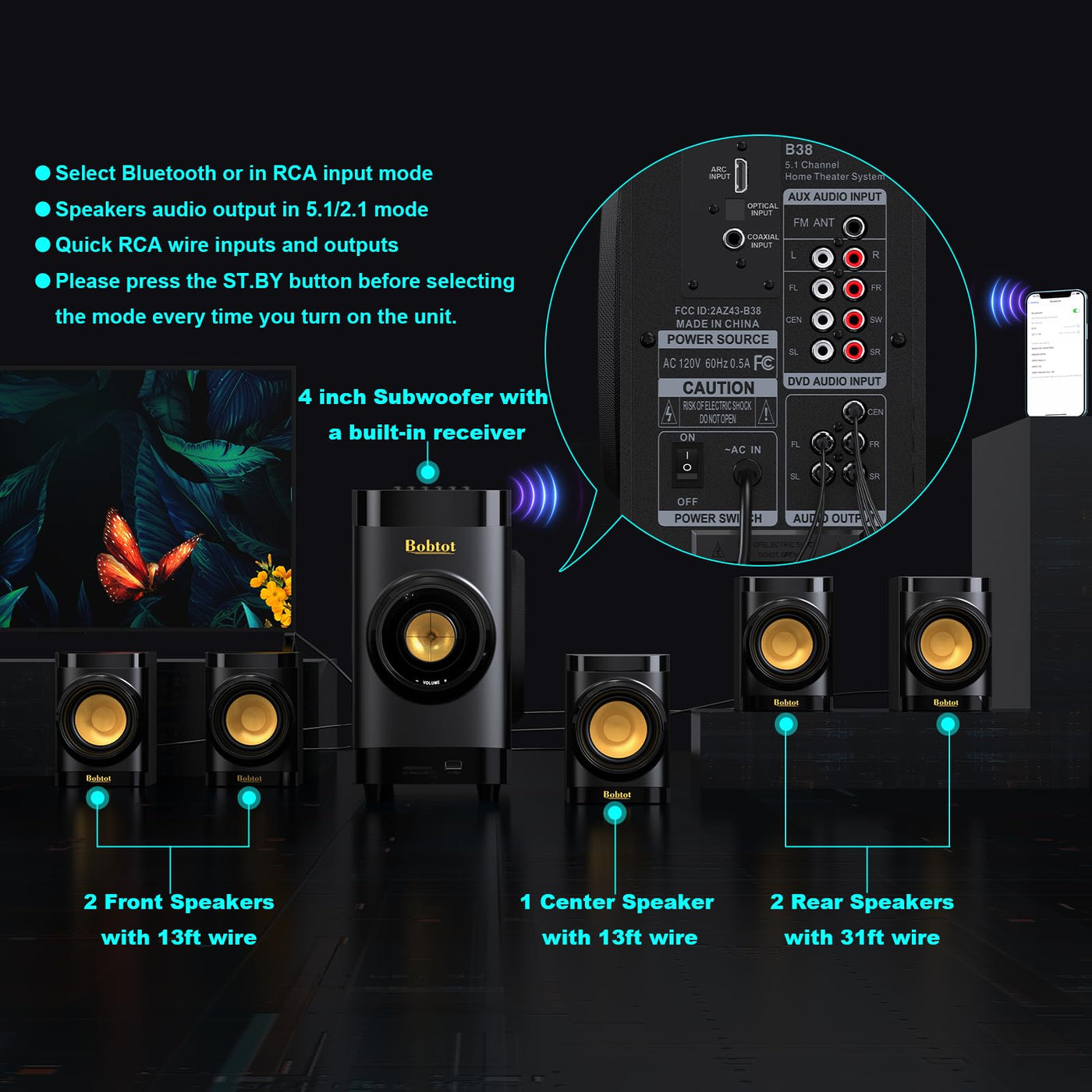 Surround Sound Systems Small 5.1 Home Theater System Speakers For Tv Subwoofer With Hdmi Arc Optical Bluetooth Input Stereo Home