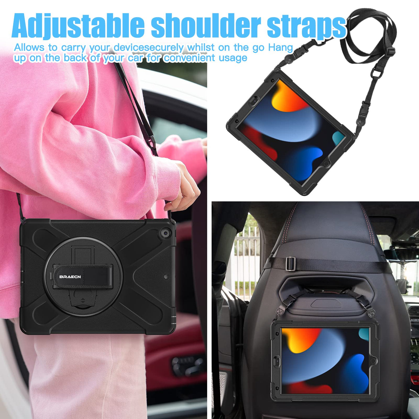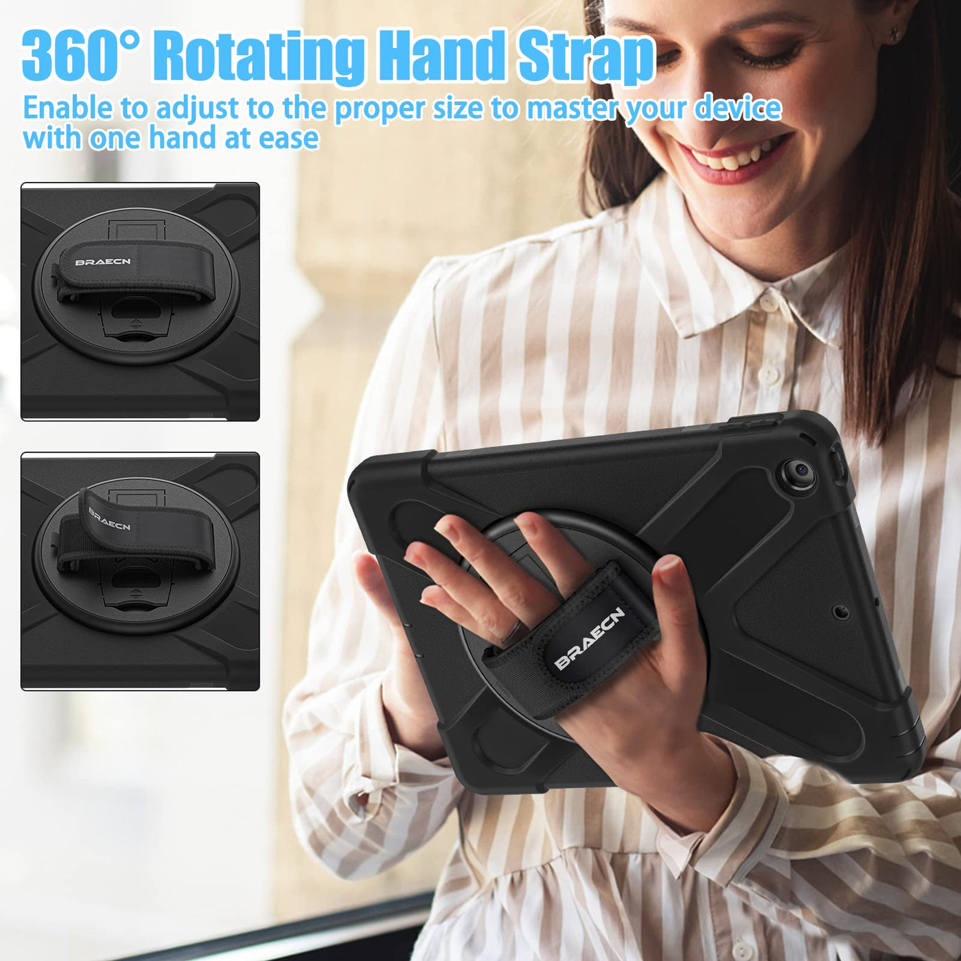 Braecnstock Apple Ipad 9Th 8Th 7Th Generation Case 10.2 Inch 2021 2020 2019 With 360 Rotating Hand Strap + Stand, Shoulder Strap, Screen Protector Shockproof Rugged Heavy Duty Protection Suitable For Any People (Men Women Kids Girls Old Man ) Suitable For Any Scene (Trave, Working, Meeting, Warehouse, Car, In School Or Outdoors )