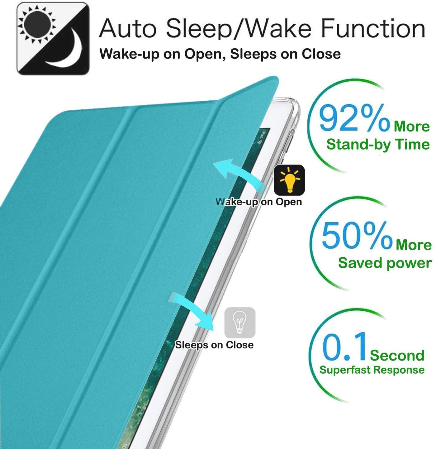 Q: How does the Smart Auto Sleep/Wake function work?A: The Smart Auto Sleep/Wake function is activated by a built-in magnet that automatically wakes your iPad when the case is opened and puts it to sleep when closed, helping to conserve battery life.