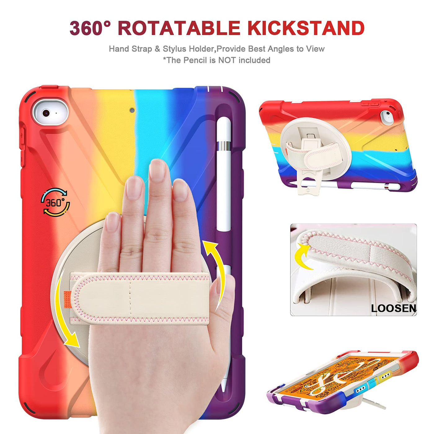 Q: What makes the kickstand feature of this case convenient?A: The 360-degree rotatable kickstand allows for versatile viewing angles, making it ideal for watching videos or typing. It also includes a hand strap for added convenience, especially useful for teachers and professionals who need to hold the iPad securely.