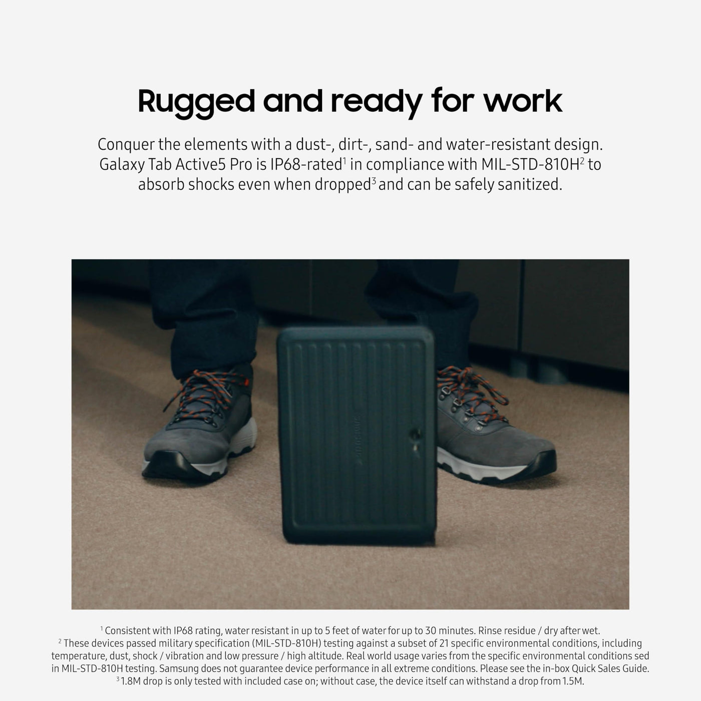 Give Your Frontline Team A Tablet Thats More Than Up To The Job With Galaxy Tab Active5 Pro. This Tablet Helps Your Crew Do More With Less While Staying Productive Onsite Or In The Truck - Perfect For Field Workers And Industries Like Delivery Services, Warehouses And Law Enforcement. A Durable And Water-Resistant Design Withstands Drops, Spills And Extreme Heat And Cold. The Responsive Touchscreen Makes It Easy To Knock Out Tasks - It Even Works If Youre Wearing Gloves Or With Water On It. Keep The Workflow Going With Dual Hotswap Battery Functionality - Simply Swap Out One Long-Lasting Battery For A Fresh One4 Without Having To Reboot To Ensure Seamless Operation (*When Changing One Battery At A Time). Customizable Features, Such As Hot Keys, Empower Your Workers By Letting Them Turn The Tablet Into A Scanner Or A Walkie-Talkie. Plus, Your Employees Will Work Efficiently Since Tab Active5 Pro Is Part Of A Rich System Of Partner Software And Hardware Integrations They Already Know And Respect. And Youll Experience Peace Of Mind Knowing Tab Active5 Pro Is Designed With The Built-In Protection Of Knox Security To Help Keep Your Businesss Data Away From Prying Eyes. Galaxy Tab Active5 Pro - Built To Keep Up With Your Workday.