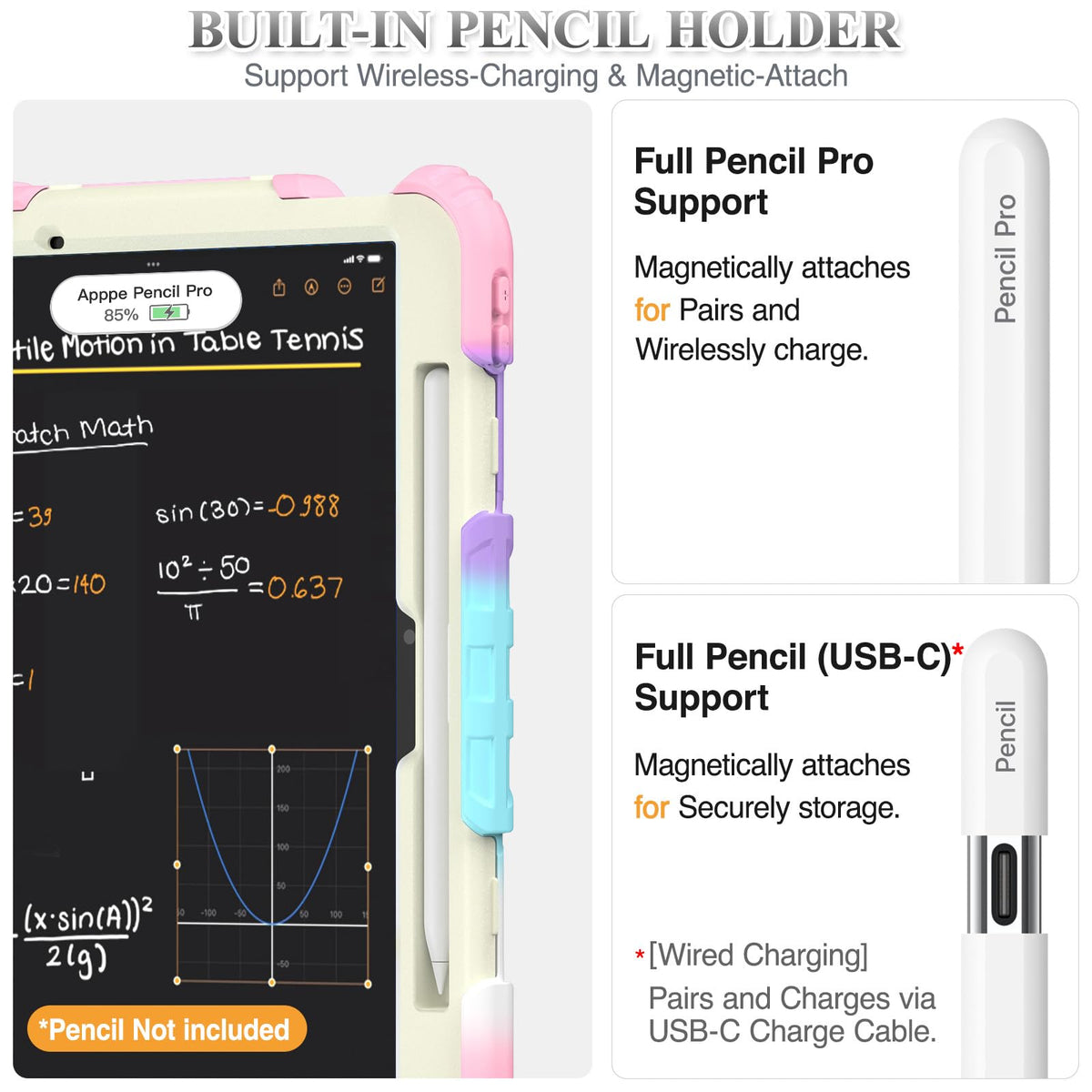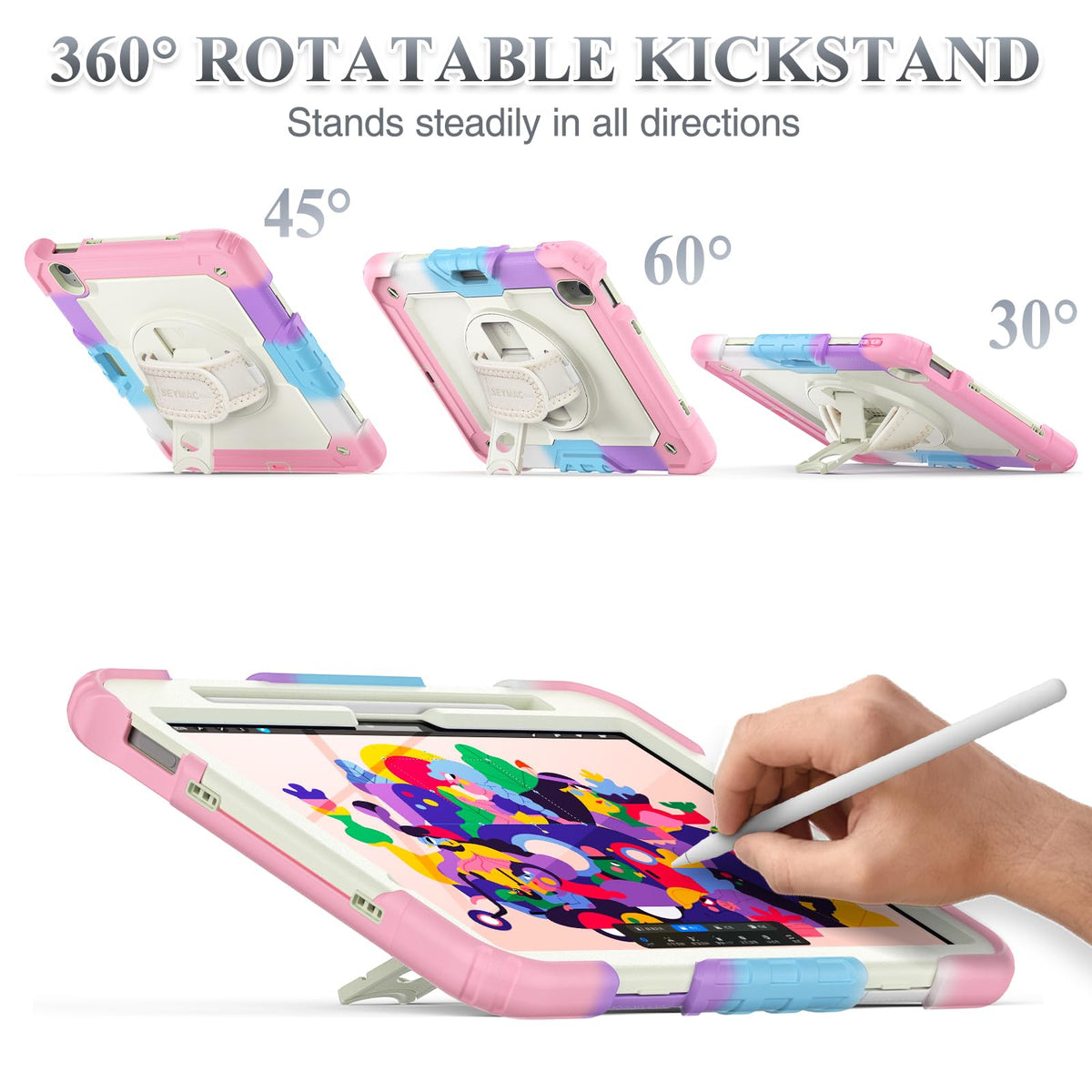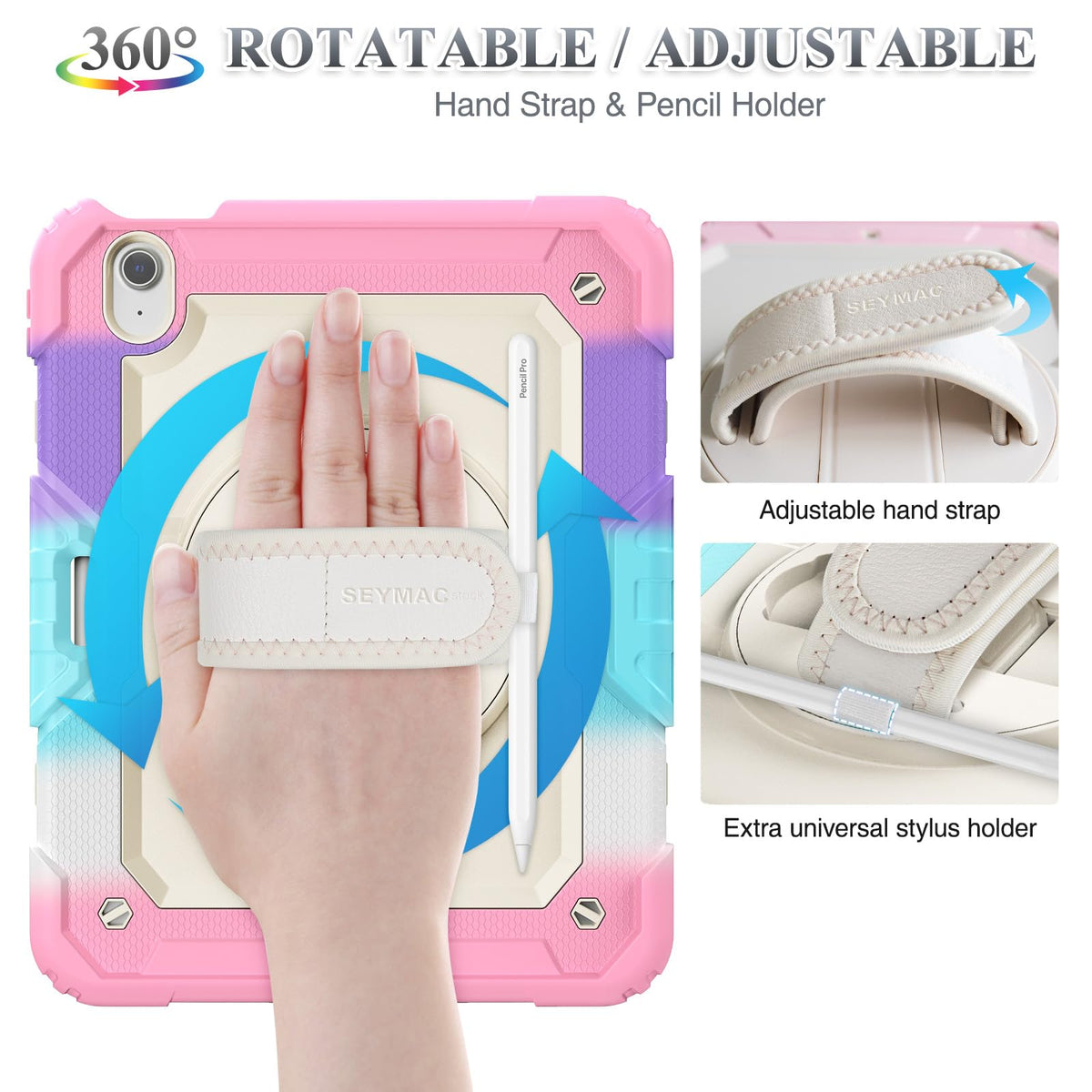 Q: What features make this case suitable for professionals and students?A: The case features a 360° rotating adjustable kickstand for comfortable viewing and typing, a built-in pencil holder for easy access to your Apple Pencil, and a soft hand strap for one-handed use, making it ideal for presentations and note-taking.