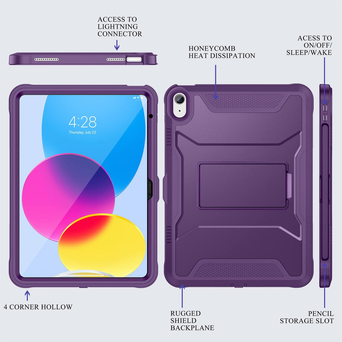 Compatible With:Supveco Full-Body Protective Case For The New Ipad 10Th Generation 2022 Release(10.9-Inches). Model Number: A2696 A2757 A2777.--------------------------------------Product Features:Quality Material:Smooth Surface And Excellent Texture. Made Of A Premium Tpu Frame Of Exterior And A Hard Pc Back Shell, Which Is A Rugged, Comfortable, And Nice Protective Cover For Your Tablet.Built-In Screen Protector:The Built-In Screen Protector Can Prevent Scratches Without Affecting Sensitivity And Protect Your Ipad 10Th Generation Screen From Damage. ?Note: Tear Off The Exterior And Interior Protective Film While Installing, Please.Honeycomb Heat Dissipation: Thoughtful Internal Grid Design Of Pc And Silica Gel Back Layers Helps Ipad Heat Dissipation.Stable Stand Mode:The Functional Kickstand Cover Can Be Positioned As A Desktop Viewing Stand Or Keyboard Stand. Allows Easy Access To Your Favorite Shows, Movies, And Games While On The Go.Drop Protection:Unique Corner Protective Bumps And Shock-Absorbing Design Help Your Tablet Away From The Damage Of Collision, Drop, And Impact Forces.--------------------------------------Package Content:1 X Ipad 10Th Generation Case 2022 10.9 Inches.--------------------------------------Welcome To Show Your Feeling And Experience With This Item!