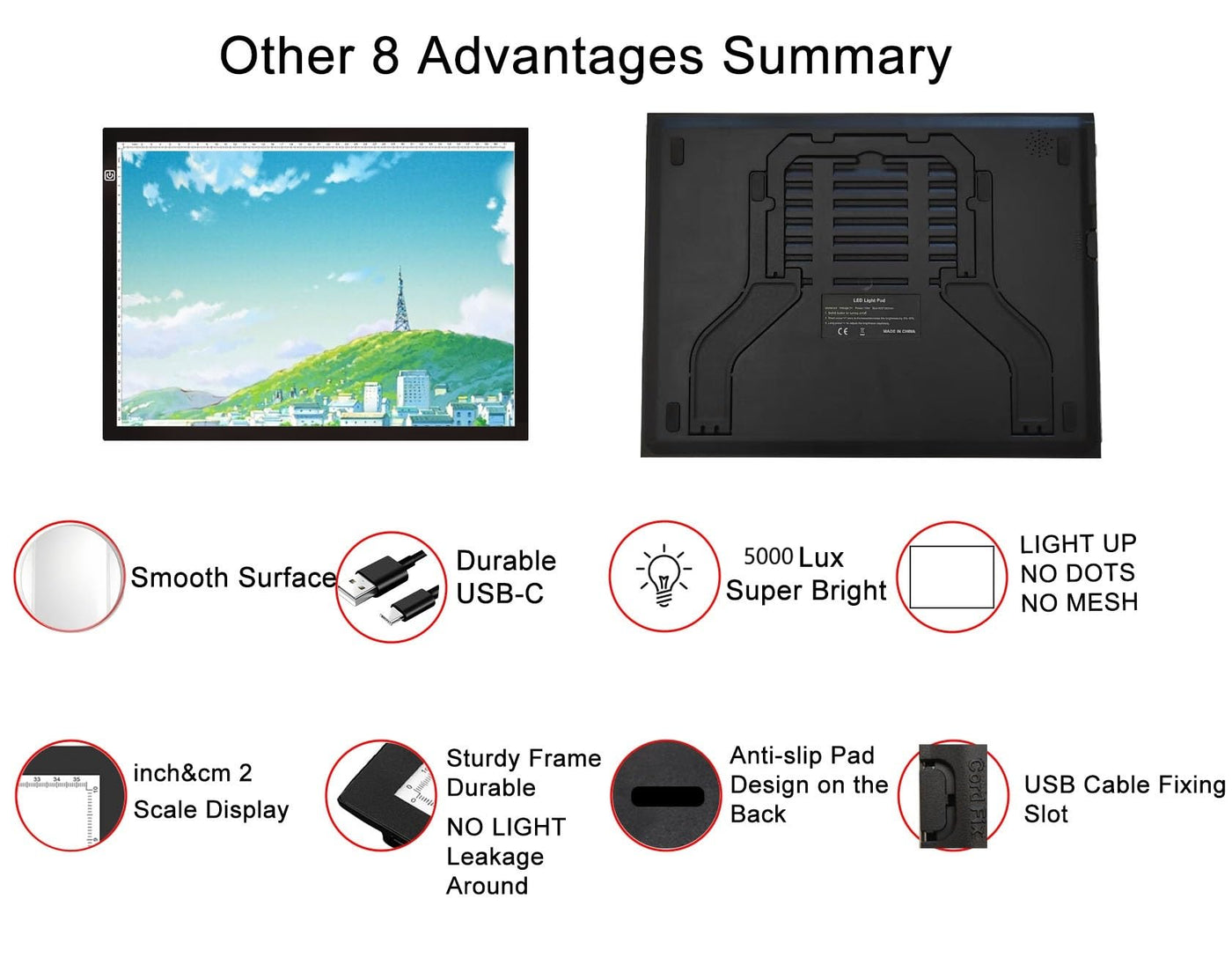 ???Built-In Stand?The Diamond Painting Light Pad A3 Built-In Stand, 7-Level Adjustable Tilt Angle, 6 Anti-Skid Pads Design. So You Dont Need To Bend Over And Hunch Back. | ???Side Buttons Design, More Professional?The Diamond Painting Light Pad A3 Switches And Dimming Buttons On The Panel Are Moved To The Side Of The Product, Which Completely Avoids The Headache Of Accidental Touching. Short Press +/- Once To Brighten/Dark One Level Of Brightness, This Mode Supports 9 Brightness Levels; Long Press +/- To Quickly Brighten/Dark, This Mode Supports Countless Brightness Levels. | ???Diamond Painting Accessories Light Pad A3?The Diamond Art Light Pad A3 L:16.6Inch