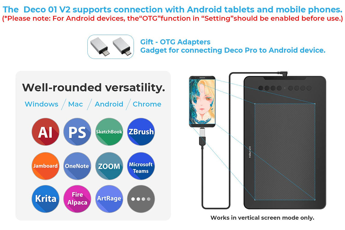 1. Important Reminderxp-Pen Deco01V2 Drawing Tablet Must Be Connected To A Laptop/Desktop/Chromebook To Work, Its Compatible With Windows 10/8/7(32/64Bit), Mac Os 10.10 Or Above Os, Chrome Os 88.0.4324.109 And Above Os. 2. Connection Tipsyour Laptop/Desktop Needs To Have Usb-A Port Available For The Connection. If Your Computer Does Not Have Usb-A Port, Then You Need An Extra Converter For The Connection, Such As Usb-C To Usb-A Etc. (Depends On What Ports That Your Laptop/Desktop Has). 3. Install The Xp-Pen Driver On Your Computer 1-Before Driver Installation: Please Remove Other Brands Driver From Your Computer And Reboot Before Installing The Xp-Pens Driver, Or There Will Driver Conflict Problems. 2-Driver Download: Our Driver Will Be Regularly Updated, So Please Go To Our Official Web To Download The Newest Driver, And Install It On Your Computer. 3-For Windows Users:Please Close All Drawing Programs And Run The Xp-Pen Driver As Administrator When Installing. (Important) 4. For Mac Mojave (10.14), Catalina (10.15) And Above Os Users: Mac Mojave (10.14) Or Above Os Has Upgraded In The Security Section, You Need To Put Programs You Newly Downloaded Into The Accessibility List First To Normally Use It. Details Steps Please See The Faq Section On The Xp-Pen Web. 5. After-Sale Service From Xp-Penplease Checks The Quick Guide, Or Search Xp-Pen Online To Find A Way To Us For Further Assistance Whenever You Encounter Problems With The Use Of The Deco01V2 Graphics Tablet, We Are Always Standing By To Help! Xp-Pen Provides A One-Year Warranty And Lifetime Tech Support. 6. Programs Please Install A Programs To Your Computer Before Your Art Creation/Online Teaching/Remote Work.Free Drawing Programs Like Gimp, Firealpaca, Krita , Medibang, Etc.Or Register Your Xppen Deco01V2 Graphics Tablet On Xp-Pen Web To Apply For An Artrage Lite, Explain Everything Program.