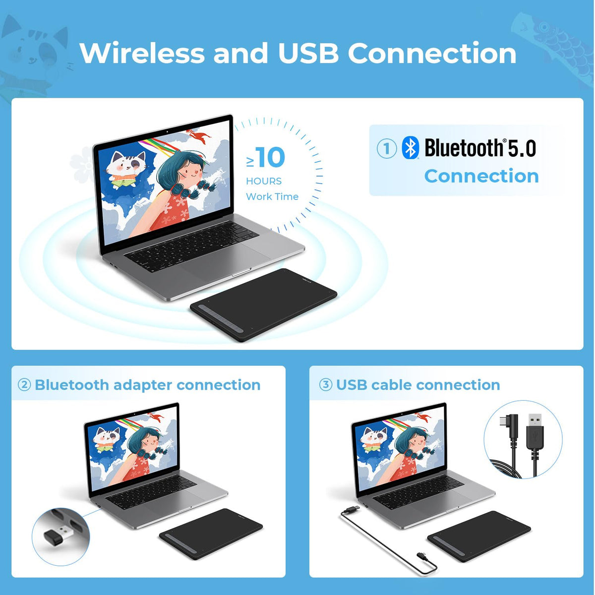 [Wired And Wireless Connection] In Addition To The Usb Wireless Receiver Connection And Wire Connection, The Deco Lw Wireless Graphic Tablet For Pc Is Delicately Integrated With Advanced Bluetooth 5.0 Chips For Reliable Wireless Connections. Besides, The Portable Size(10 X 6 Inches Drawing Area) Is Convenient For You To Travel With. Xppen Wireless Draiwing Pads Give You Complete Freedom To Shift Around And Be As Comfortable As Possible With No Wires Coming In Or Out Of Your Way