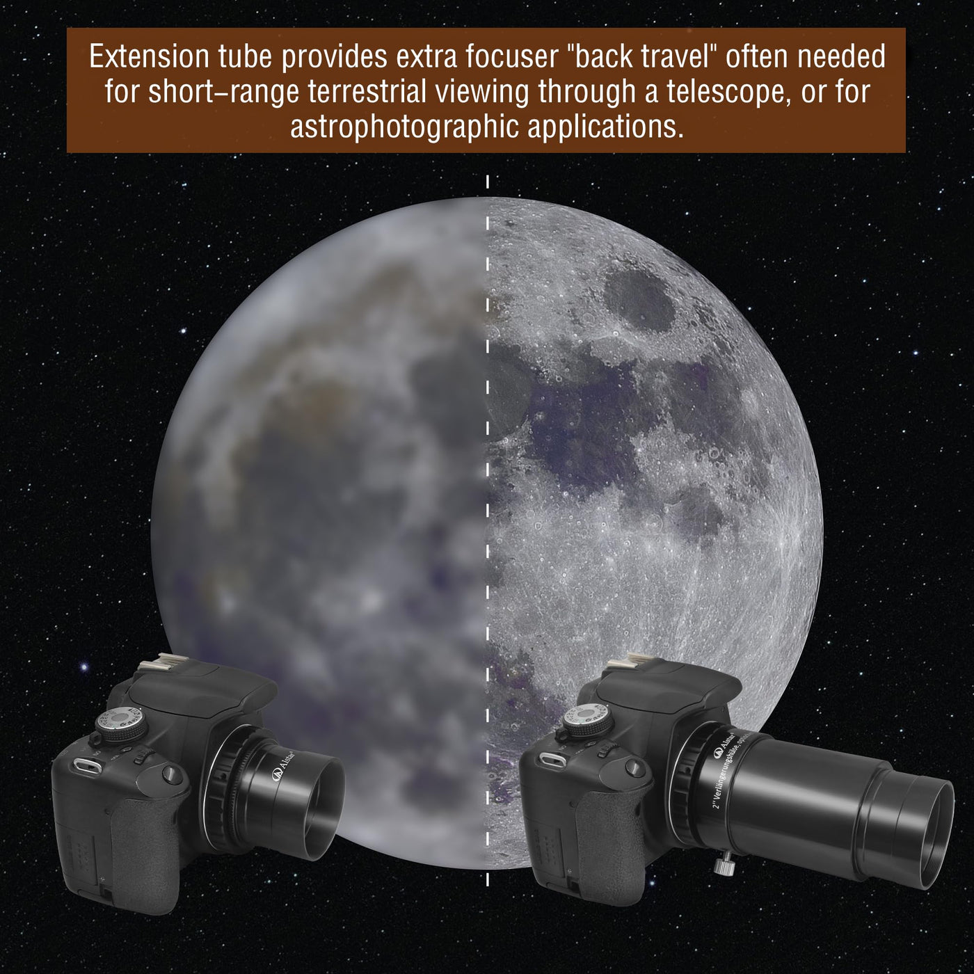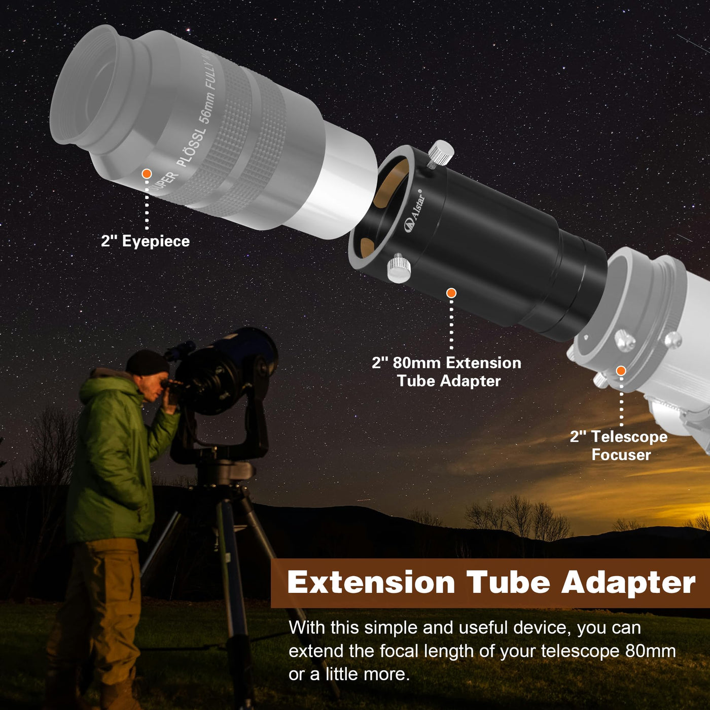 Alstar 2-Inch Telescope Eyepiece Extension Tube Adapter Provide Extra Focuser Back Travel Sometimes Needed To Achieve Focus With Certain Eyepiece Or Telescope Combinations. More Back Travel Is Often Needed For Short-Range Terrestrial Viewing Or With Use Of A Field Flattener, Coma Corrector, Or Focal Reducer Lens. Extension Tube Provides Extra Focuser ''Back Travel'' Often Needed For Short-Range Terrestrial Viewing Through A Telescope, Or For Astrophotographic Applications. Fits In 2'' Telescope Focusers, And Accepts 2'' Eyepieces Or Accessories. Features Two Locking Thumbscrews To Secure Any Inserted Astronomy Accessory, With A Brass Compression Insh To Prevent The Marring Of Your Telescope Accessories. Machined Of High Quality Aluminum And Anodized Black, Durable For Long Time Use.