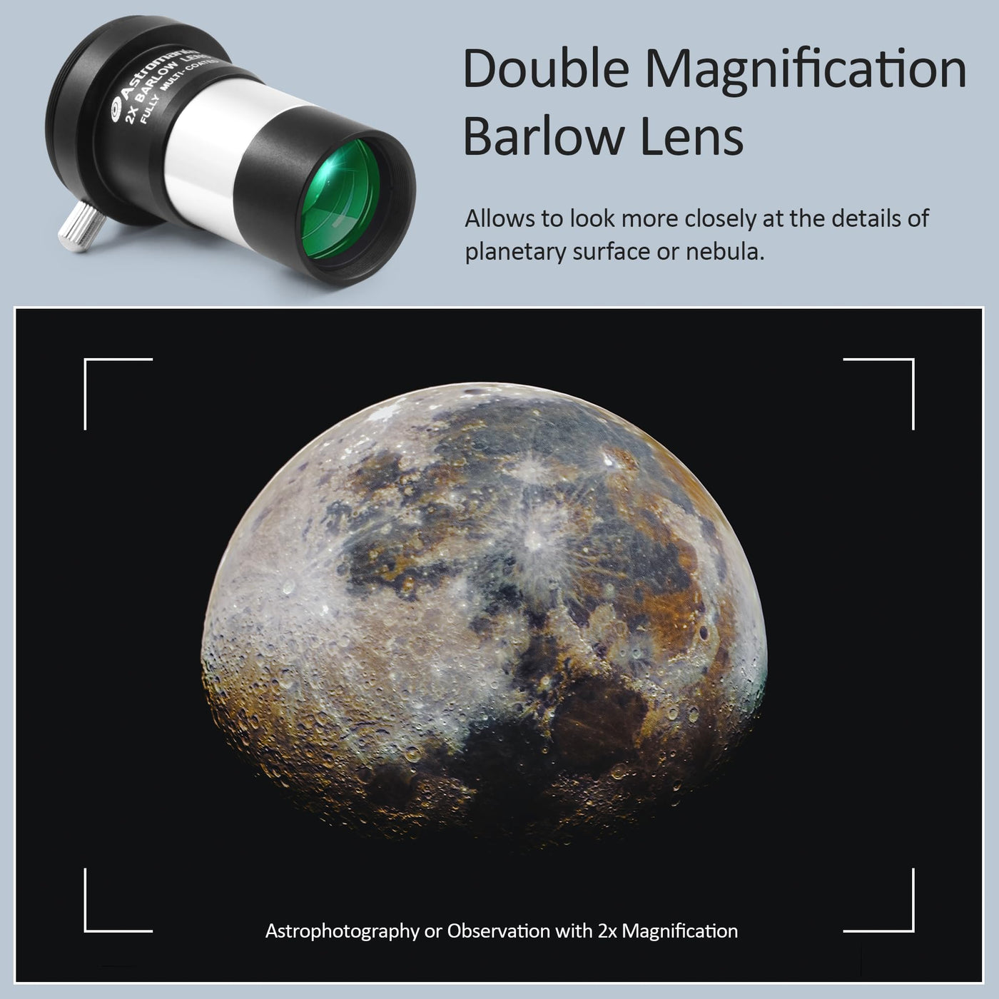 2'' Barlow Inserts Between The Eyepiece And A 2'' Eyepiece Holder On The Telescope And Increases The Magnification By 2.5X. It Can Be Used With 1.25'' Eyepiece And 2'' Eyepieces. The 4-Element Fully Multicoated Lens Assembly Offers Superb Field Flatness And Minimal Chromatic Aberration.