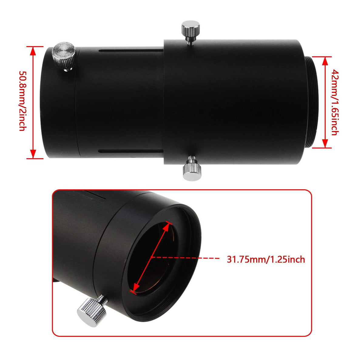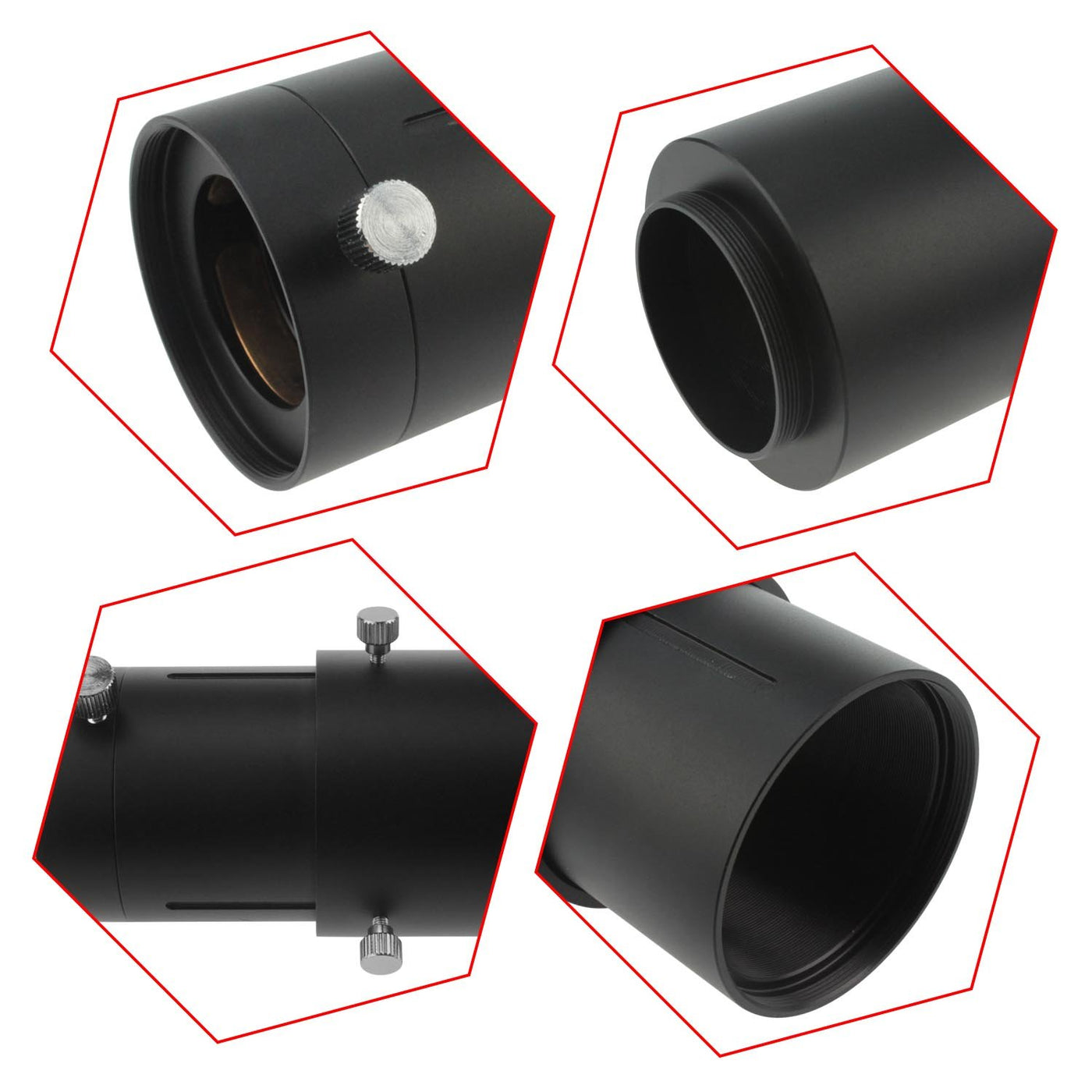 Useful For Prime-Focus With Refractors Or Reflector Telescopes. Allows You To Vary The Magnification By Simply Changing The Position Of Your Camera. Fits All Standard 2'' Astro Telescopes. Threaded For Standard 2'' Telescope Filters. Slides Into 2Inch Telescope Focuser Or 1.25Inch Focuser With Step-Down Adapter; Has T-Threads For Attachment Of Camera Body. All Metal Construction. Anodizing Aluminium Process.