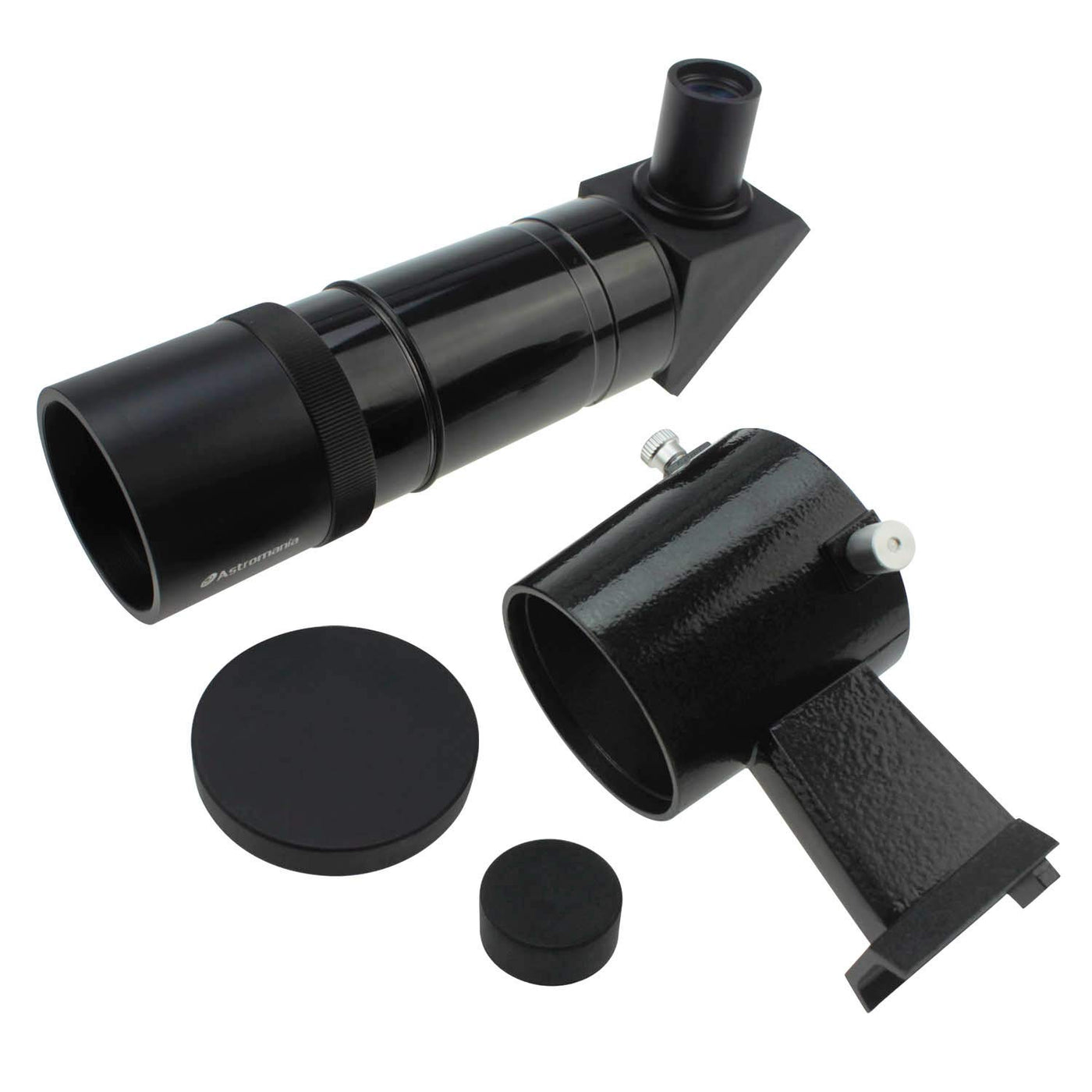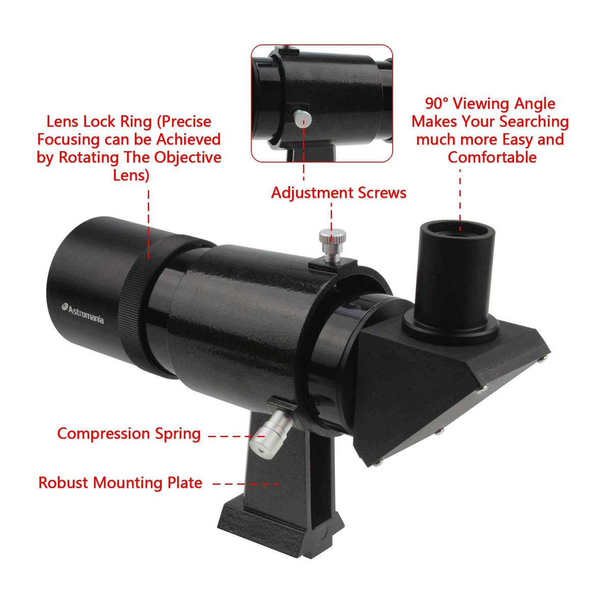This Finder Scope Has A 50Mm Aperture, And So Provides A Particularly Bright Image. Objects Which You Are Not Even Able To See Using Just The Naked Eye Will Usually Become Directly Visible. Also, If You Are Trying To Locate One Of The Brighter Dsos, This Will No Longer Be Able To Remain Hidden, Giving Itself Up To Your Searching Eye. A Star Map With Reference Stars With Which One Can Orient Oneself Is Usually Used To Find Particular Objects. Some Of The Stars Shown On Star Maps Cannot Be Seen, Or Are Difficult To See, With Just The Naked Eye However. This Finder Scope Makes A Large Number Of Aditional Stars Available - A Big Plus For Being Able To Successfully Locate Objects.The Astromania 9X50 Finder Scope Has Built-In Crosshairs To Let You Find The Correct Object More Easily And To Put It In The Middle Of The Main Telescope'S Field Of View. The Threads Have Been Kept Quite Fine But Are Still Very Visible Against The Night Sky Nevertheless. Two Adjustment Screws And A Compression Spring Allow Very Rapid Alignment With The Main Telescope. Precise Focusing Can Be Achieved By Rotating The Objective Lens. The Finder Scope Will Fit Into A Large Range Of Holders: Skywatcher, Celestron, Vixen, Orion, Gso And Many Other Makes Have Compatible Finder Scope Shoes.