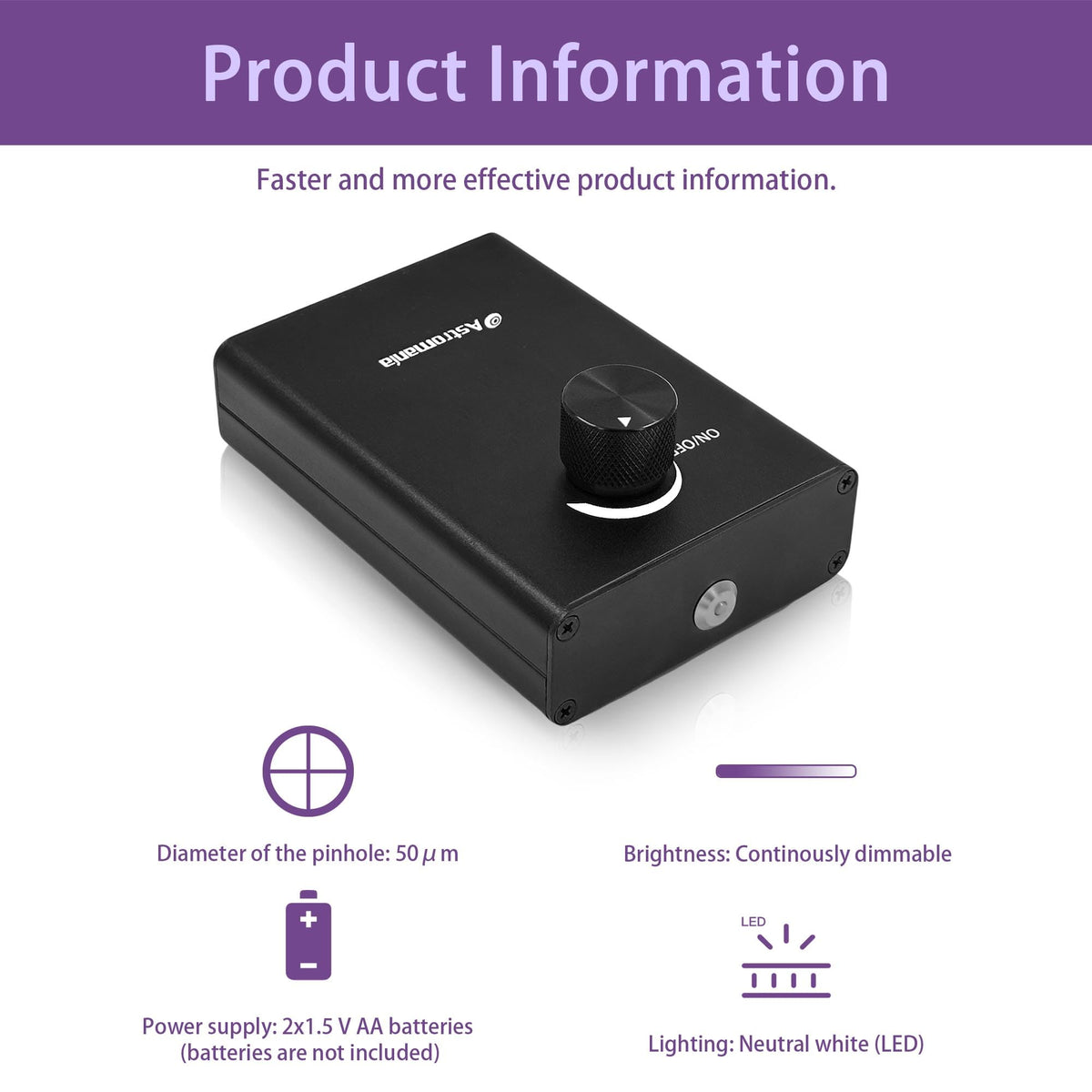 Astromania Artificial Star This Artificial Star Enables Yout To Test Your Telescope And Also To Adjust It Perfectly. Use The Valuable Clear Nights For Working With Your Telescope. The Motto: Never Adjust In The Night Again - Whith The Astromania Artificial Star, A Star For Testing And Adjusting Is Always At Your Hand: Here The Adjustment Of The Telescope Is Much More Accurately Than At Night, As You Work In Closed Rooms And Have No Problem With Air Turbulence. Furthermore, It Is Always A Problem To Make Use Of Tools In Front Of The Optics When Its Dark. Something Can Be Dropped Too Easily And Then ... Practical Tip From Astromania-Service: In Order To Collimate A Telescope Or To Detect Optical Aberrations Such As Astigmatism Or Coma You Need Only A Short Distance Between The Telescope And The Artificial Star. In These Cases Due To The Extended Focal Plane You May Need Extension Tubes In Order To Reach Focus. Dpherical Aberration Is Very Difficult To Detect Using An Artificial Star. You Should Set Up The Star At A Much Greater Distance From The Telescope. We Recommend A Distance In Meters That Is Equal To One Third Of The Aperture In Millimeters. For Instance, For A Telescope With 200 Mm Aperture You Should Set Up The Artificial Star At Least 66 M Away From The Telescope. Here We Recommend Using A Real Star. Details: Diameter Of The Pinhole: 50M Lighting: Neutral White (Led) Power Supply: 2X 1.5 V Aa Batteries (Batteries Are Non Included) Brightness: Continously Dimmable And Off-Switch Housing Material: Aluminum Tripod Connection: Photo Tripod Connection Via 1/4'' Photo Thread