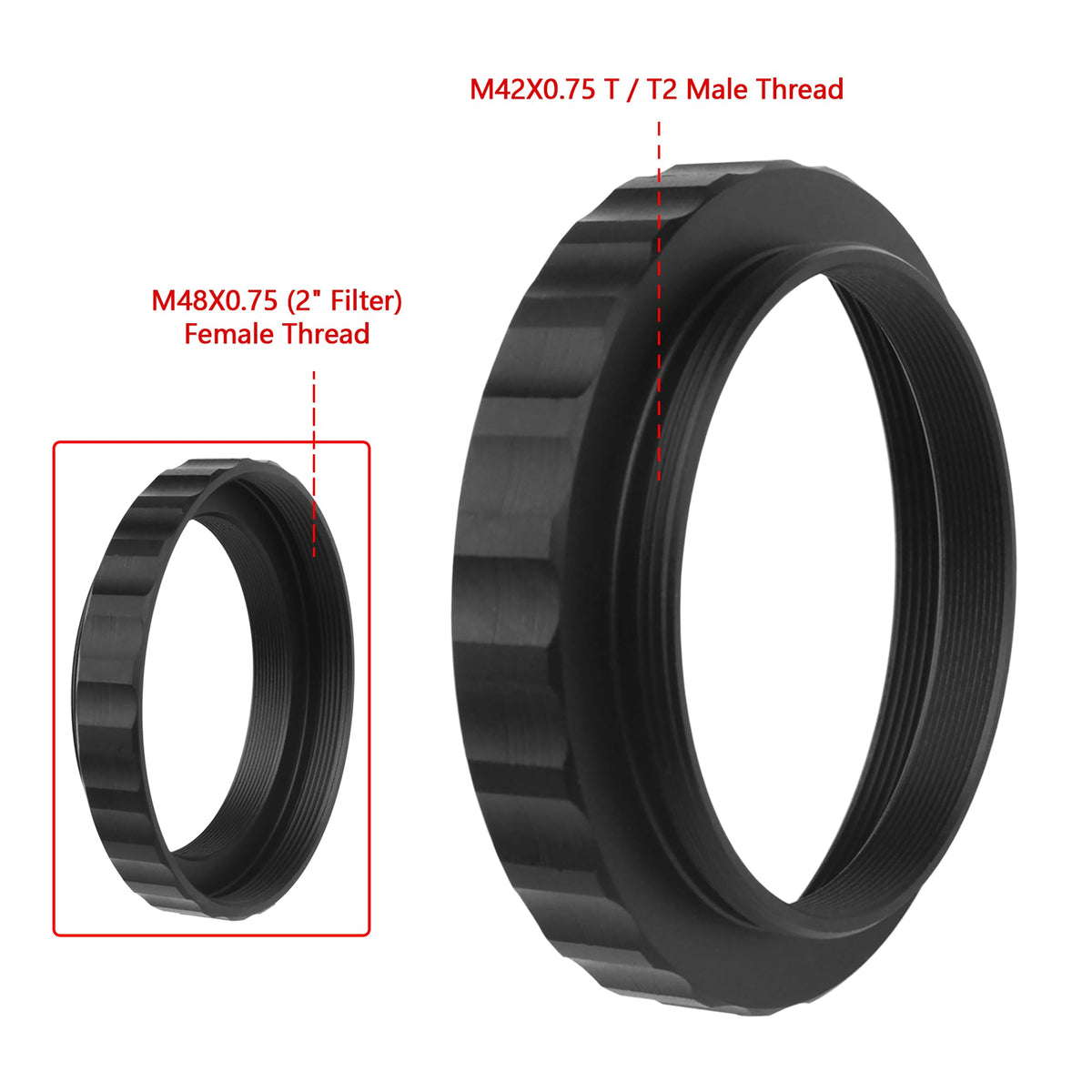 Female M48X0.75 Thread (2'' Filter Thread) Male T2 Thread (M42X0.75) Effective Optical Length: 2Mm (Not Counting The T2 Male Thread) Outside Diameter: 2''