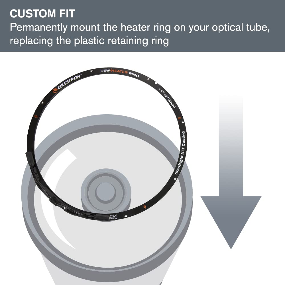 The Celestron Dew Heater Ring Is The Ideal Dew Prevention Solution For Your Celestron Telescope. This Must-Have Accessory Will Improve Your Observing Or Imaging Nights Year-Round. The Dew Heater Ring Is Custom Fit For Your 11'' Celestron Schmidt-Cassegrain, Edgehd, And Rasa Optical Tube And Permanently Replaces Your Retaining Ring To Provide Efficient Heating Across The Plate And So You'Ll Never Be Caught Without It. The Process Is Quick And Easy. The Ring Is Constructed Of Lightweight, Durable Aluminum. Its Rigid Frame Supports The Cable Circuity And The Telescope'S Schmidt Corrector Lens. Plug The Ring Into An External 12V Dc Power Source For Consistent, Continuous Heat That Will Prevent Dew From Forming. The Dew Heater Ring Features Two Storage Clips On The Ring To Keep The Power And Thermistor Jacks Secure While Accommodating The Telescope'S Dust Cover. The Dew Heater Ring Also Comes With A Cable Management Clip That Connects To The Telescope'S Front Cell For A Convenient Location To Help You Corral Essential Cables Instead Of Dangling And Causing Unnecessary Weight On Your Corrector.