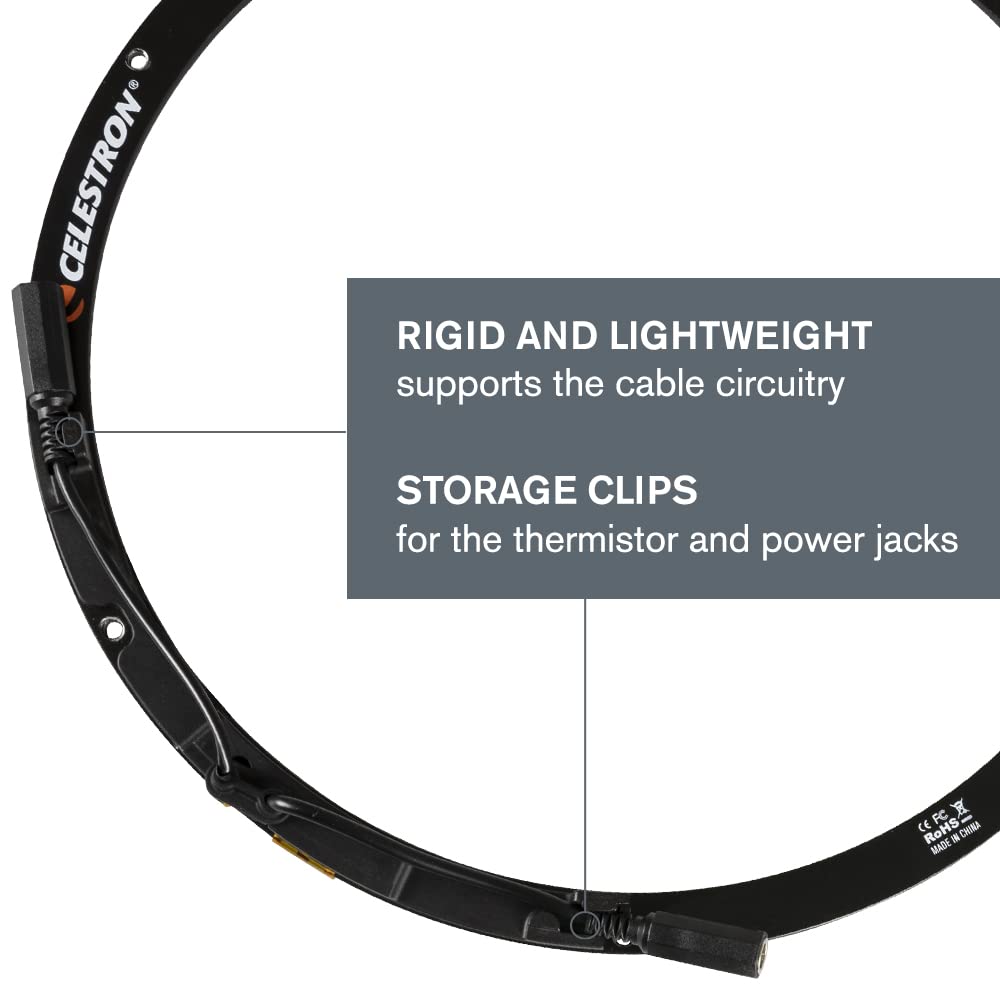 The Celestron Dew Heater Ring Is The Ideal Dew Prevention Solution For Your Celestron Telescope. This Must-Have Accessory Will Improve Your Observing Or Imaging Nights Year-Round. The Dew Heater Ring Is Custom Fit For Your 9.25'' Celestron Schmidt-Cassegrain And Edgehd Optical Tube And Permanently Replaces Your Retaining Ring To Provide Efficient Heating Across The Plate And So You'Ll Never Be Caught Without It. The Process Is Quick And Easy. The Ring Is Constructed Of Lightweight, Durable Aluminum. Its Rigid Frame Supports The Cable Circuity And The Telescope'S Schmidt Corrector Lens. Plug The Ring Into An External 12V Dc Power Source For Consistent, Continuous Heat That Will Prevent Dew From Forming. The Dew Heater Ring Features Two Storage Clips On The Ring To Keep The Power And Thermistor Jacks Secure While Accommodating The Telescope'S Dust Cover. The Dew Heater Ring Also Comes With A Cable Management Clip That Connects To The Telescope'S Front Cell For A Convenient Location To Help You Corral Essential Cables Instead Of Dangling And Causing Unnecessary Weight On Your Corrector.