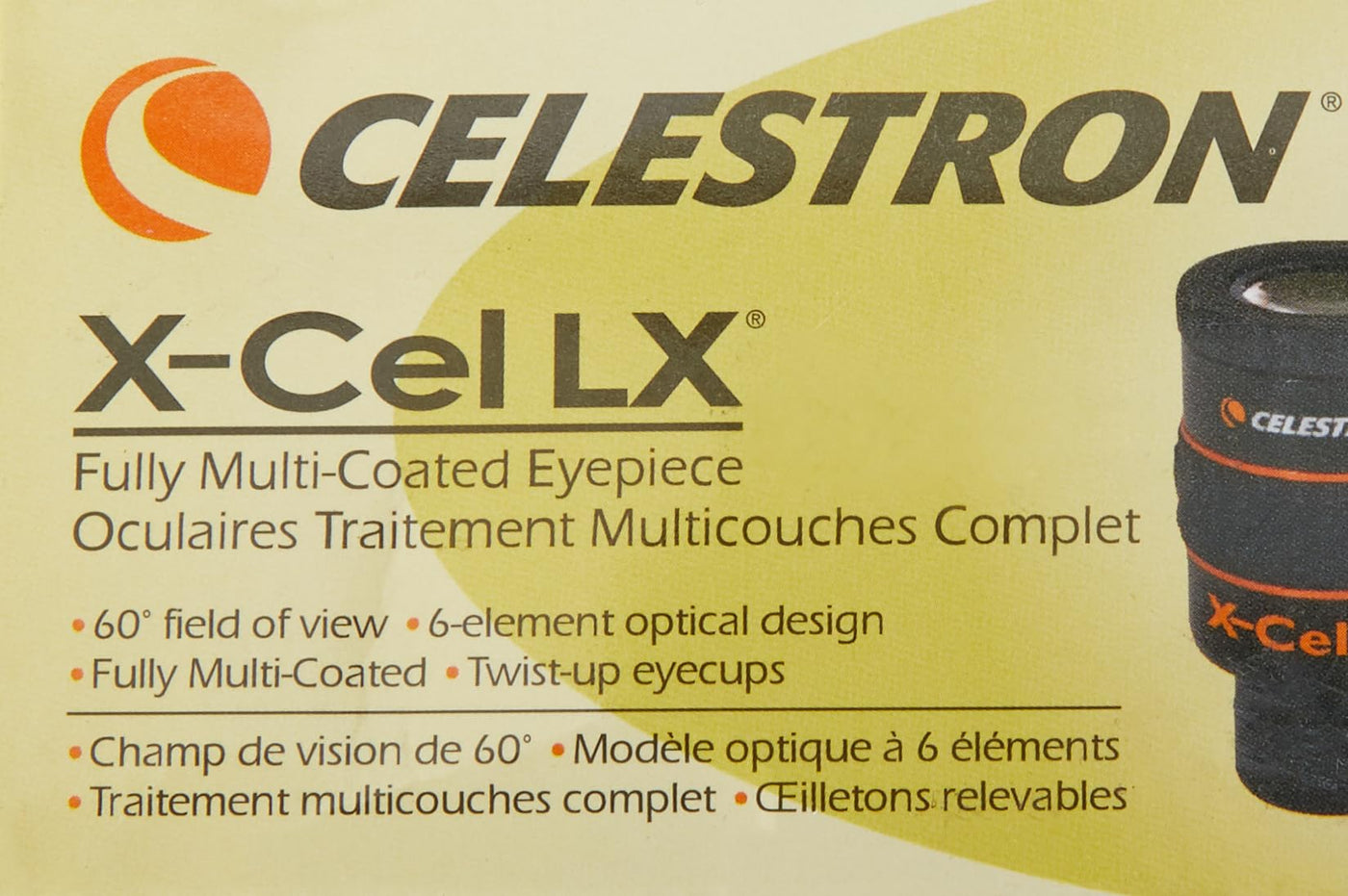 Celestron X-Cel Lx Series Eyepieces Offer A 60 Apparent Field Of View, Perfect For The Moon, The Planets, And A Plethora Of Deep-Sky Objects. The Premium Six-Element Optical Set Is Finished With Multiple Layers Of High-Transmission Coatings For Clear, Sharp Images. The Edges Of The Optics Are Blackened For Increased Contrast. All Seven X-Cel Lx Eyepieces Sport 16Mm Of Comfortable Eye Relief, And Are Parfocal, Which Means You Can Switch Out Eyepieces Within The Series During Observing Sessions And Little Or No Additional Focusing Will Be Required.The X-Cel Lx Eyepiece Body Is Made Of Black-Anodized Aluminum. The Pop-Up Eyecups Make It Easy To Adjust The Height For Different Users. Turn Them In One Direction To Extend The Length, And The Other Direction To Provide A Flat Surface, Preferable To Most Eyeglass Wearers. A Treaded Rubber Grip Around The Center Of The Eyepiece Barrel Offers Secure Handling, Even In Moist Conditions Or With Heavy Gloves On. The 1.25 Insert Barrel Is Threaded To Accept Filters.