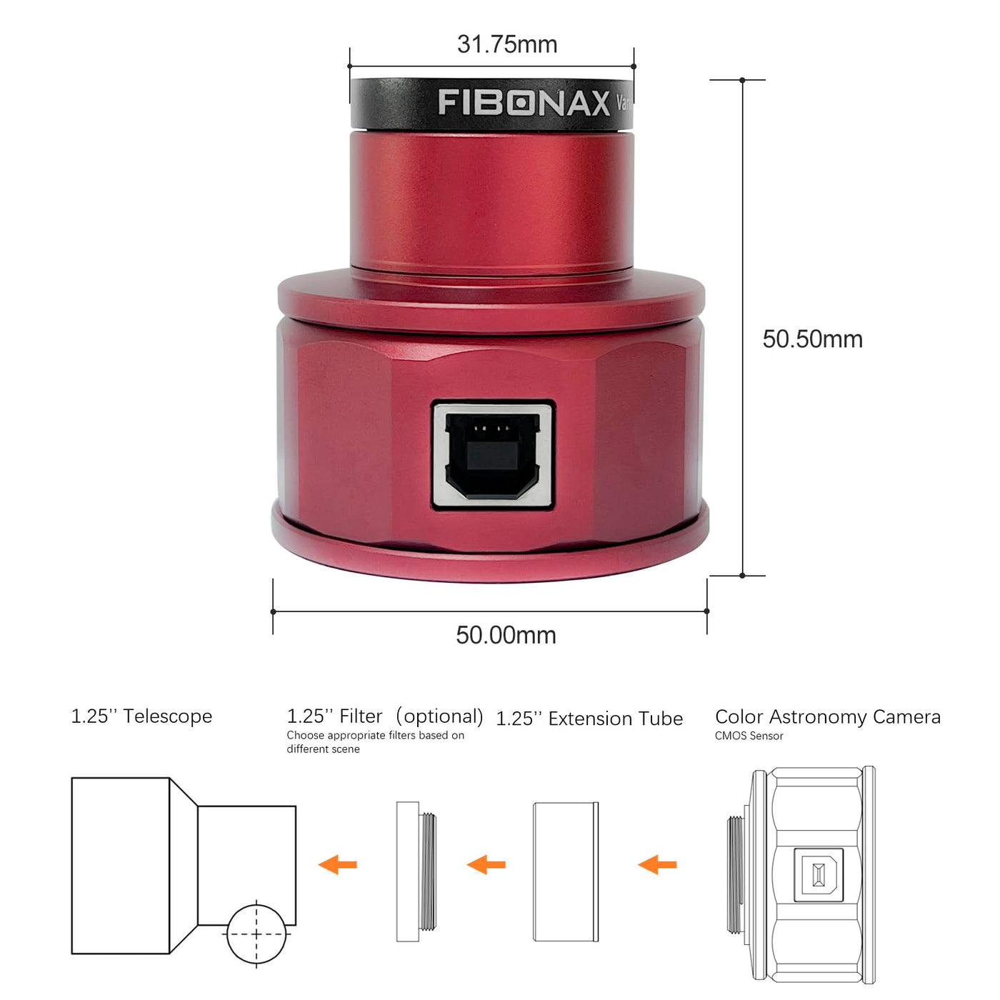 Fibonax Nova800 Astronomy Camera The Astrophotography Camera Is Perfectly Compatible With Various Operating Systems Windows/Mac Os/Linux, Plug And Play Without The Need To Install Additional Drivers. The Astronomy Camera Includes 8 Megapixel Cmos Sensor,Professional Setting Of Image Parameters For The Large Aperture Characteristics Of Telescope Lenses, Including Increasing Brightness And Reducing Noise In Dark Conditions, With The Aim Of Obtaining Clearer And More Delicate Image Effects. This Camera Is Very Suitable For Capturing Images Of The Moon, Sun (With Appropriate Solar Filters), And Planets. Usb 2.0 Interface Provides Fast And Stable High-Speed Image Frame Rate To Meet User Needs. Features: Nova Series:Nova800 Sensor: Imx179 Cmos Sensor Pixel Array:3264*2448 Maximum Frame Rate:30Fps@1080P/15Fps@8M Support System:Windows/Mac Os/Linux Support Telescope:Telescope With 1.25'' Interface Operating Temperature:32?~122? Working Humidity:10%~85% Material: Aluminum Alloy Weight:110G
