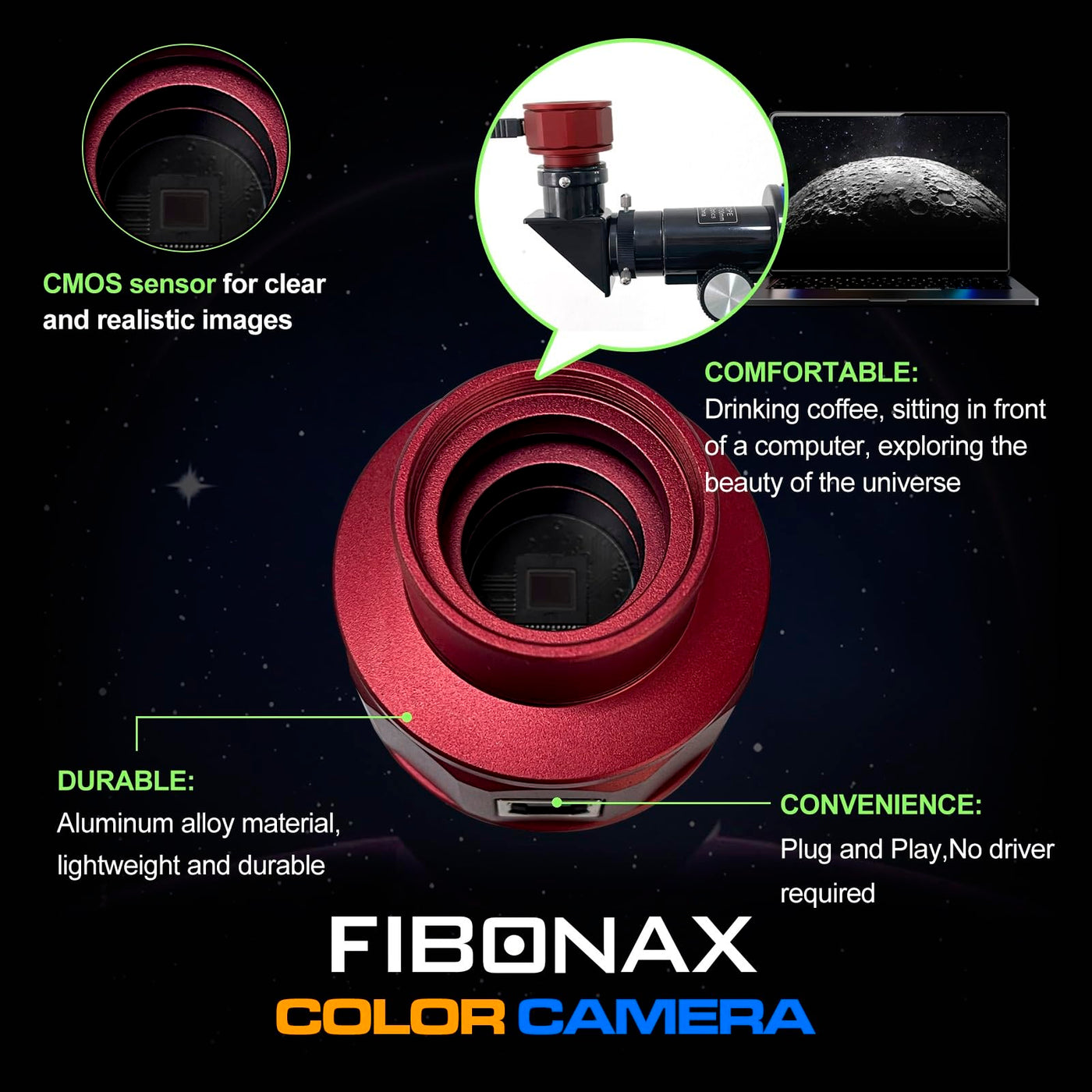 Q: What features enhance the usability of the FIBONAX Telescope Camera in low-light conditions?A: The camera includes an 8-megapixel CMOS sensor that enhances brightness and reduces noise in dark conditions, allowing for clearer and more delicate image effects when capturing celestial objects.